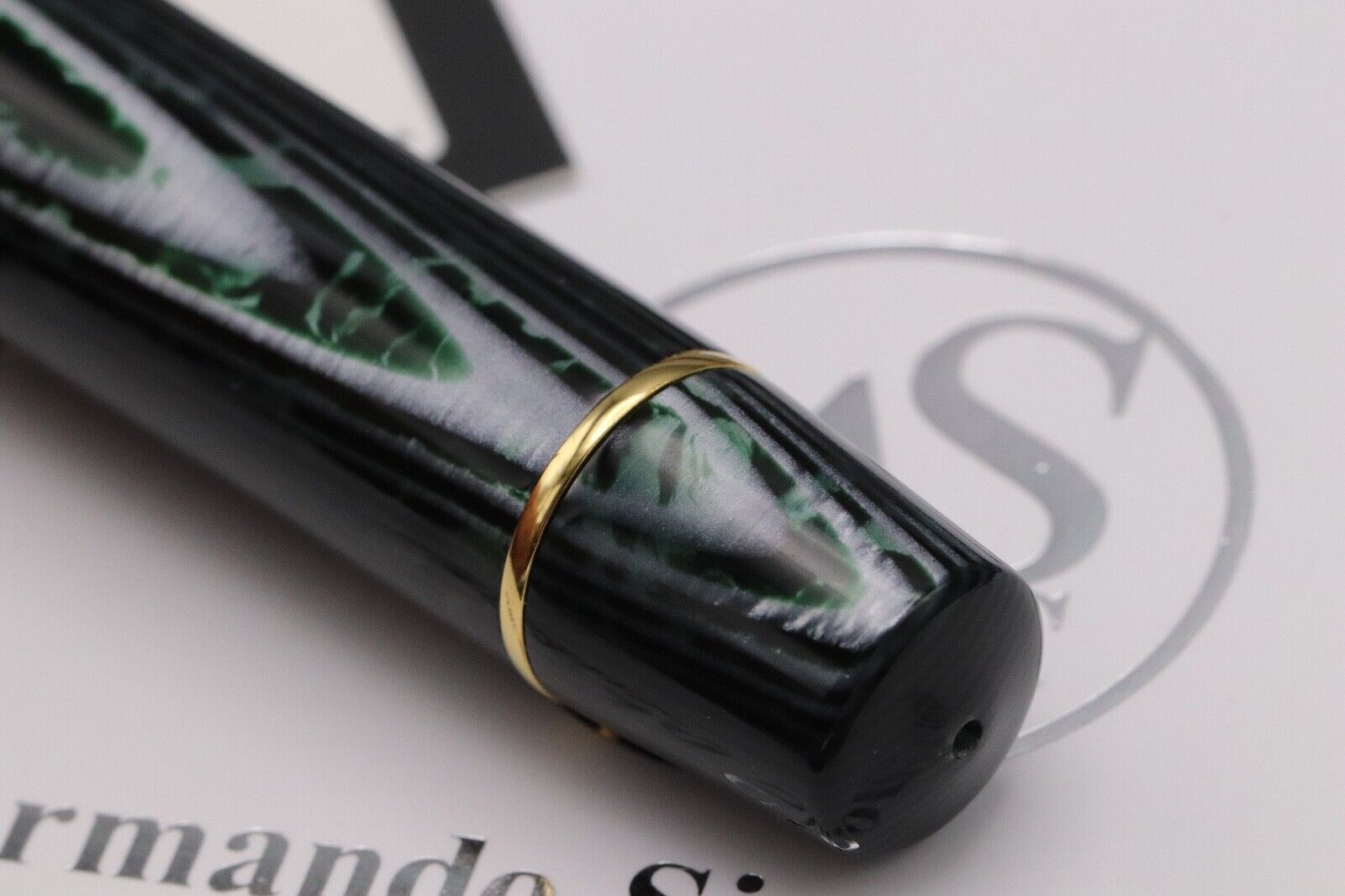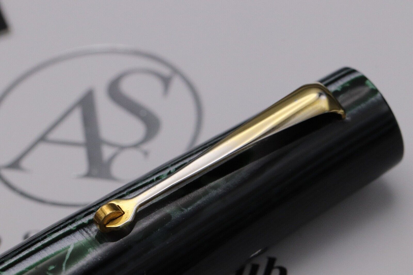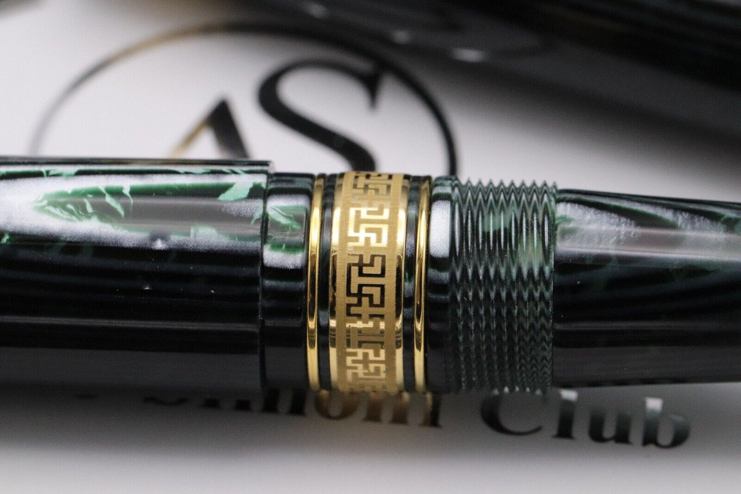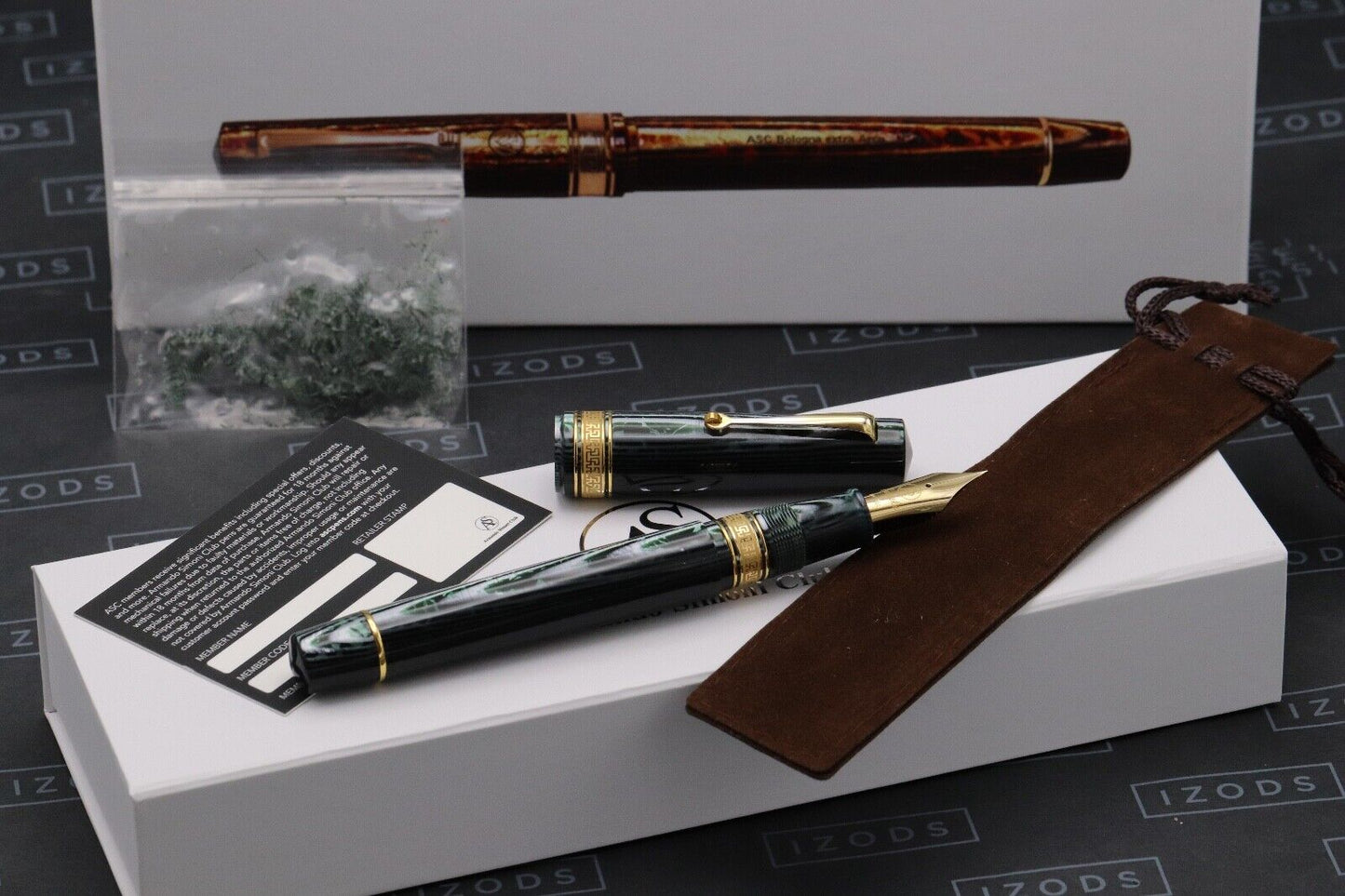 Thanks very much for looking at our listing for this wonderful ASC Bologna Extra China Bespoke Arco Verde Fountain Pen, which comes with its ASC presentation box. The pen has been lightly used and is presented in overall excellent condition - there is some wear to the gold-plating on the clip (shown in the photos). This was a special order for the original owner, as the China Bespoke pens had ruthenium trim, but ASC produced him one with gold-plated trim. It has the number 16 / 20 to match his Arco Bronze version.