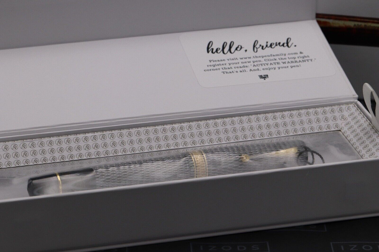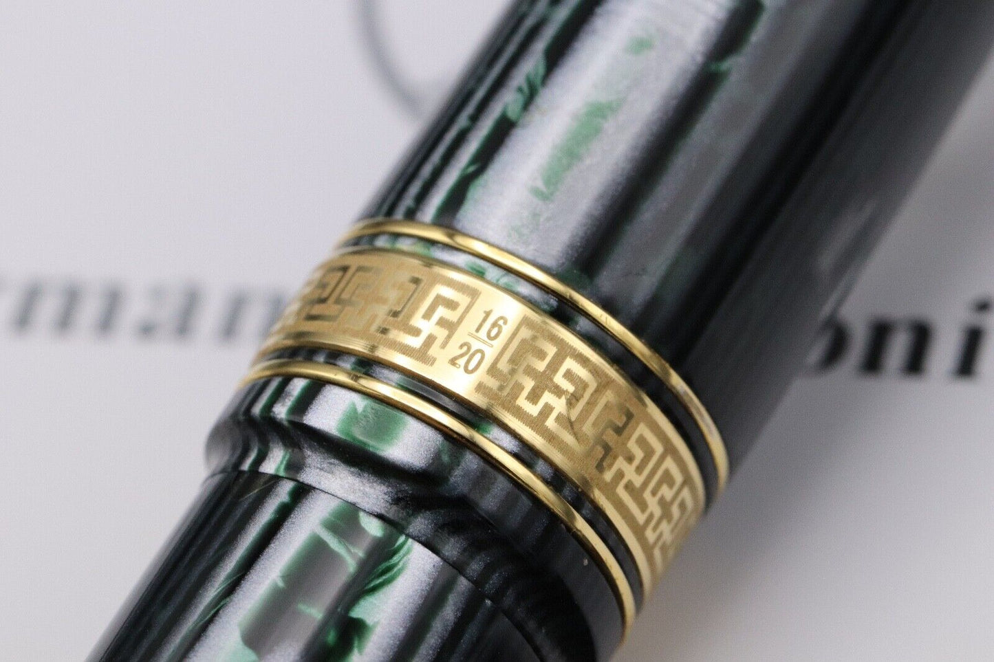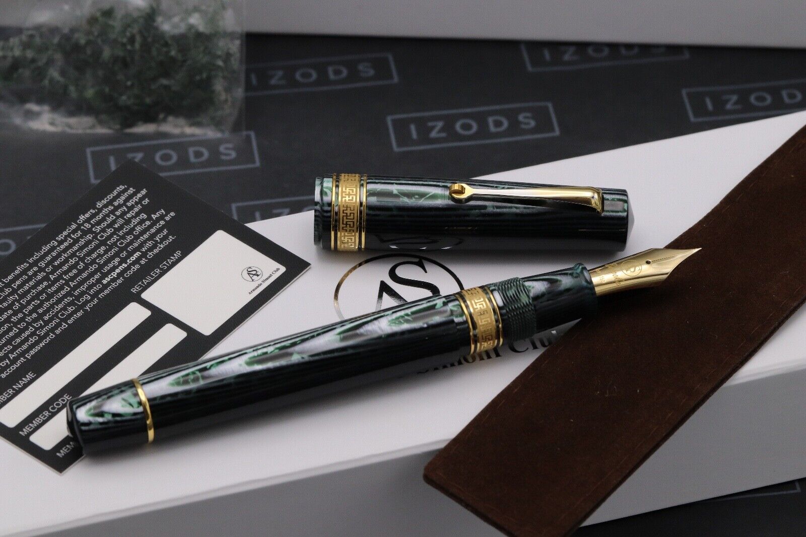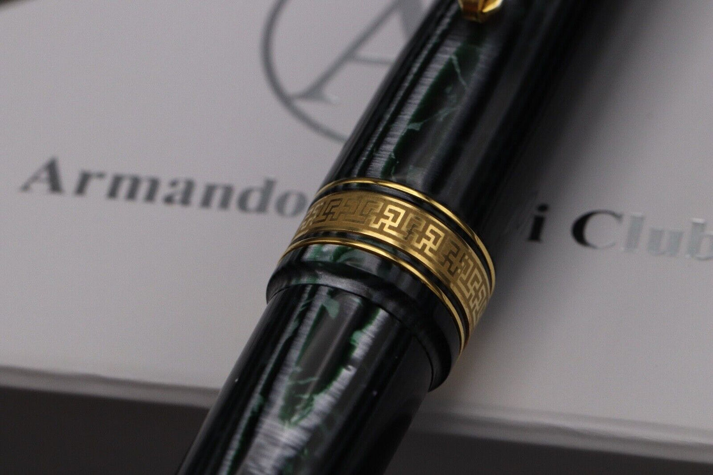 Thanks very much for looking at our listing for this wonderful ASC Bologna Extra China Bespoke Arco Verde Fountain Pen, which comes with its ASC presentation box. The pen has been lightly used and is presented in overall excellent condition - there is some wear to the gold-plating on the clip (shown in the photos). This was a special order for the original owner, as the China Bespoke pens had ruthenium trim, but ASC produced him one with gold-plated trim. It has the number 16 / 20 to match his Arco Bronze version.