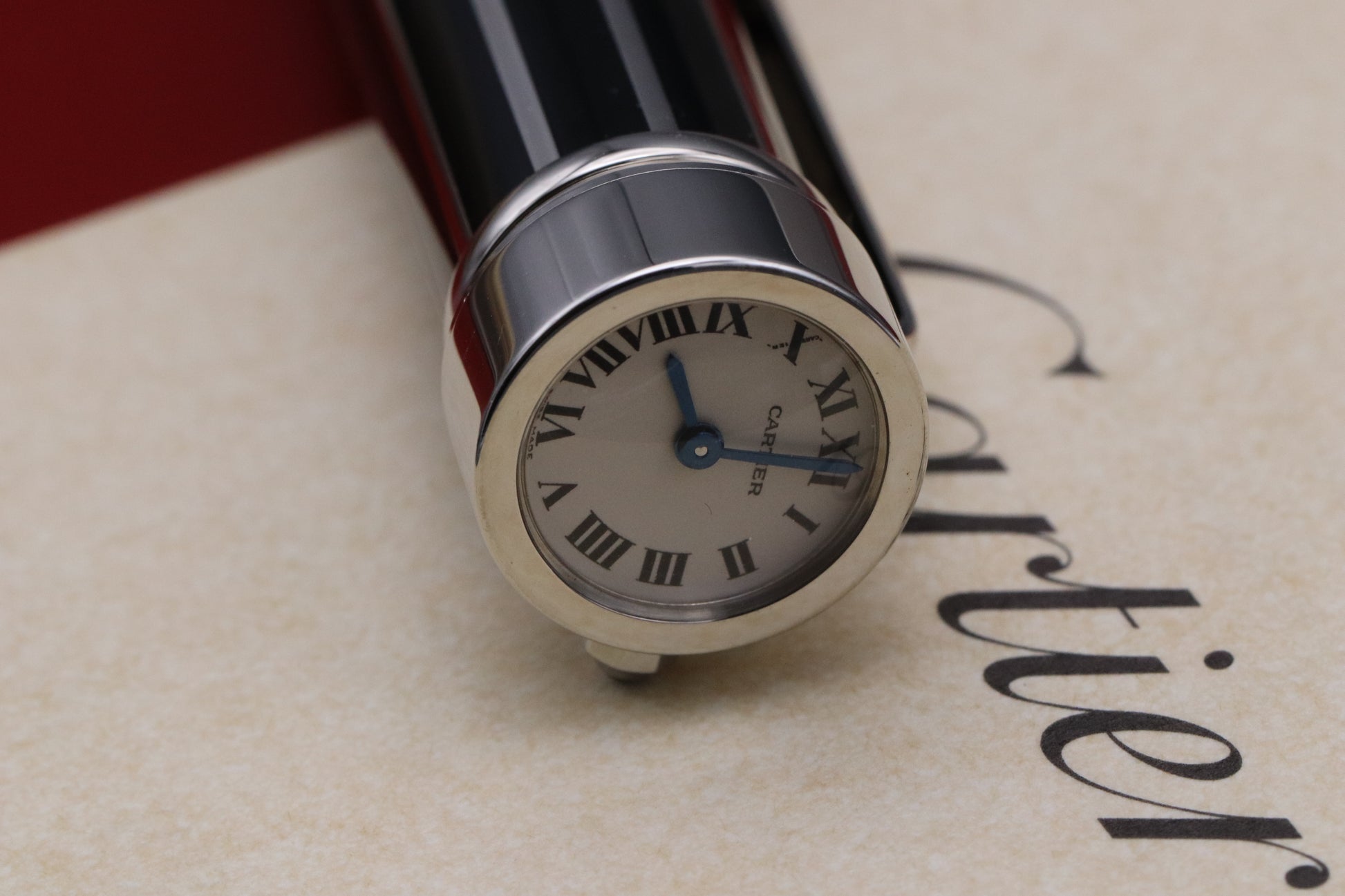 Cartier pens are renowned for their quality of finish and this one is no different. The pen has a distinctive black lacquer and platinum-coated stripe design, with the trim also being platinum-coated. Sitting atop the cap is a small clock, which has a matte off-white dial and blued steel hands.