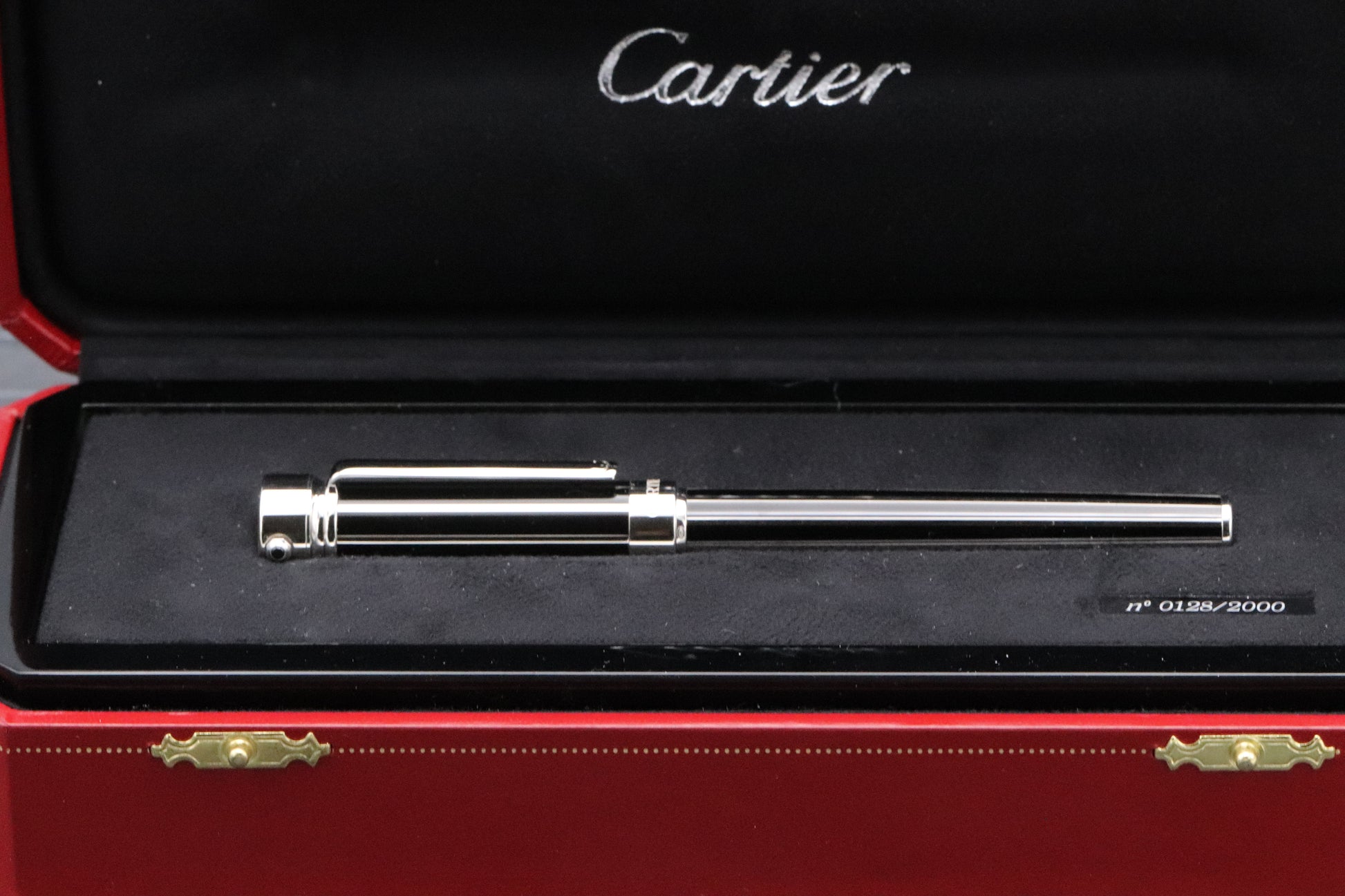 Thanks for looking at our listing for this delightful Cartier Black Lacquer Limited Edition Fountain Pen with Watch, which comes with its large Cartier presentation box (including outer), limitation certificate and stamped booklet - confirming first purchase on 15th December 2001. The pen has been very lightly used and is presented in fantastic condition. The watch will require a new battery. Only 2000 were produced and this is number 0128.