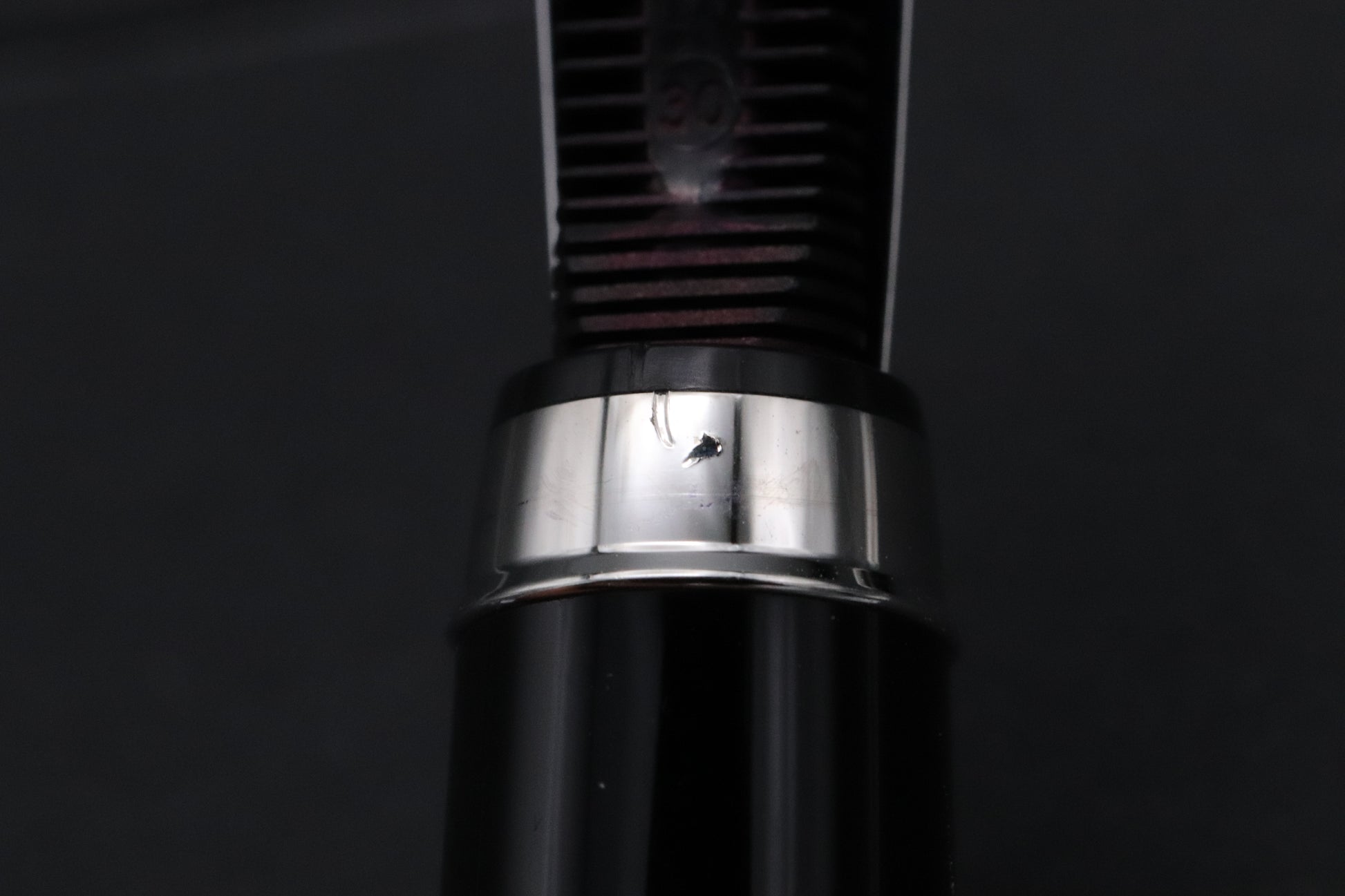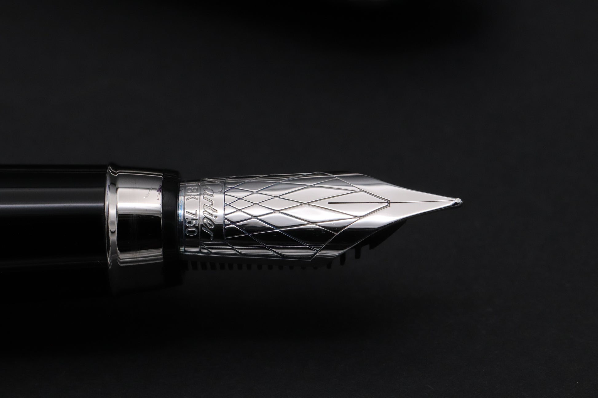 Cartier pens are renowned for their quality of finish and this one is no different. The cap features an intricate milled design, with the remainder of the pen being black resin. The trim is platinum-coated and sitting atop the pen is a blue cabochon.