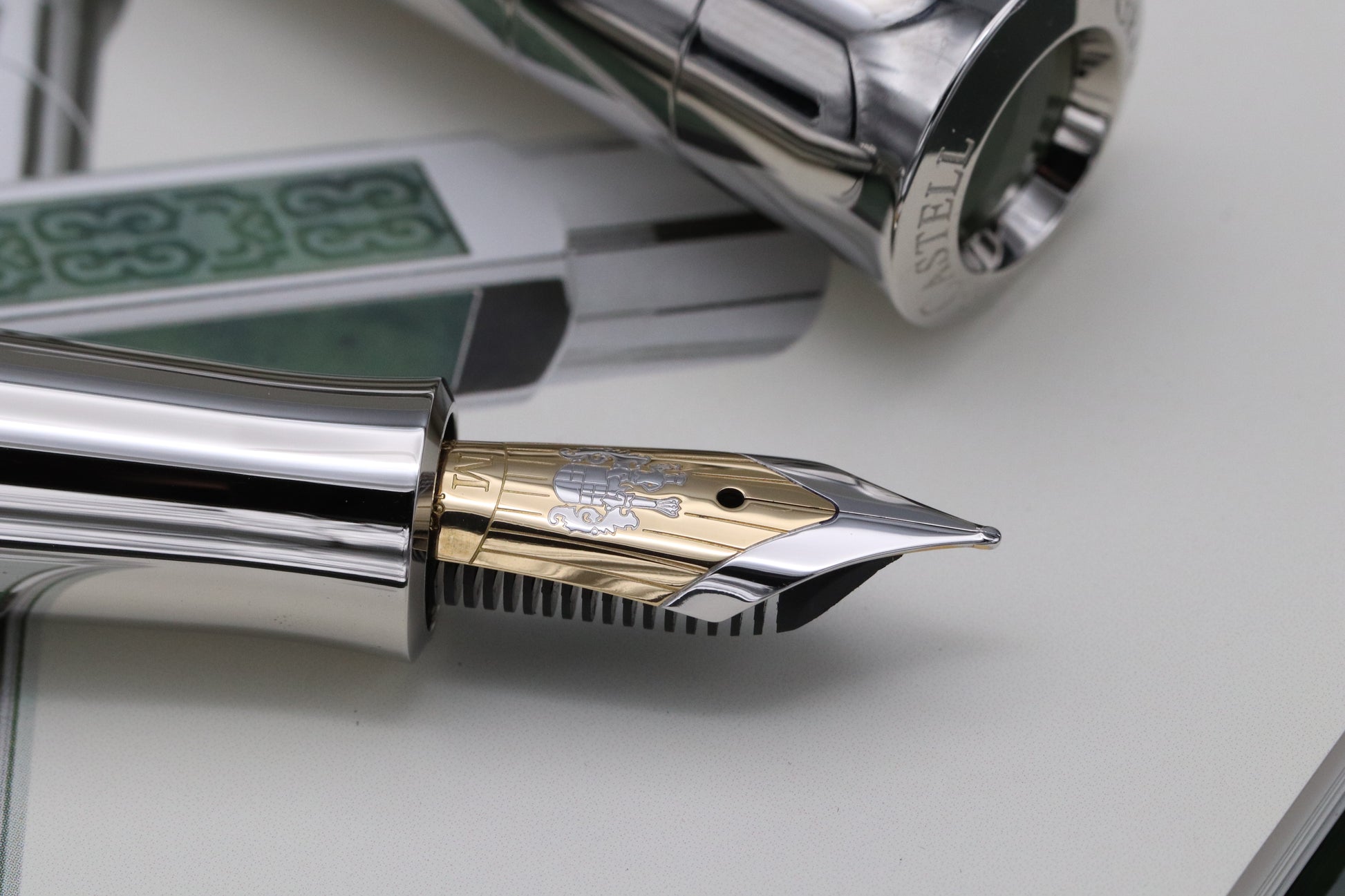 Graf von Faber-Castell are renowned for the quality and finish of their writing instruments and the Pen of the Year series is the flagship example of their craftsmanship. Since the series began various themes, materials and countries have been the focus - this particular pen is the 2011 release, which also celebrated their 250th anniversary. The barrel features six vibrant Jade panels, which have been individually hand-chiselled. The cap top and barrel cone are finished with faceted and polished stones.