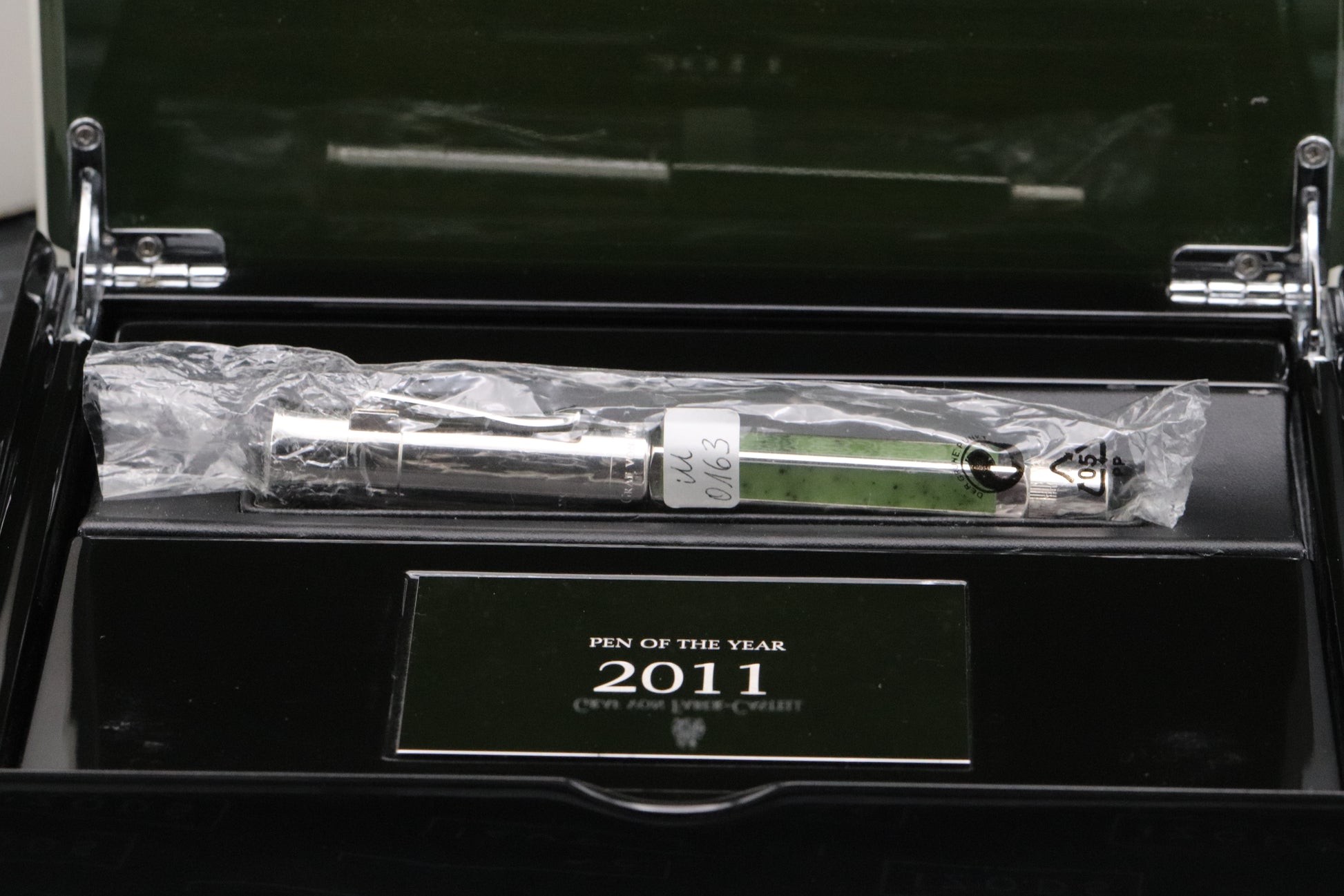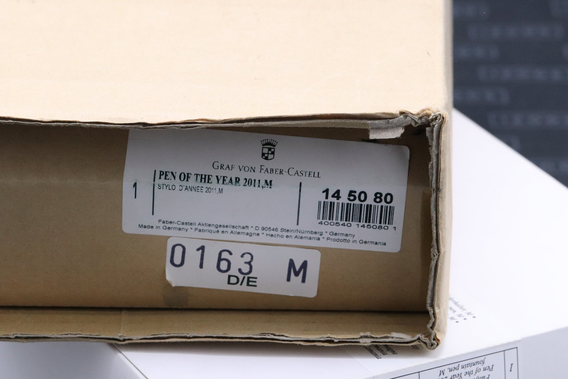 Thanks very much for looking at our listing for this Graf von Faber-Castell Pen of the Year 2011 Fountain Pen, which comes with its large lacquered presentation box (including outers) and small pen transport packaging box. The pen has never been used and is presented in essentially as new condition (a couple of tiny marks to the presentation box). This pen is number 0163 and only 1761 were produced.