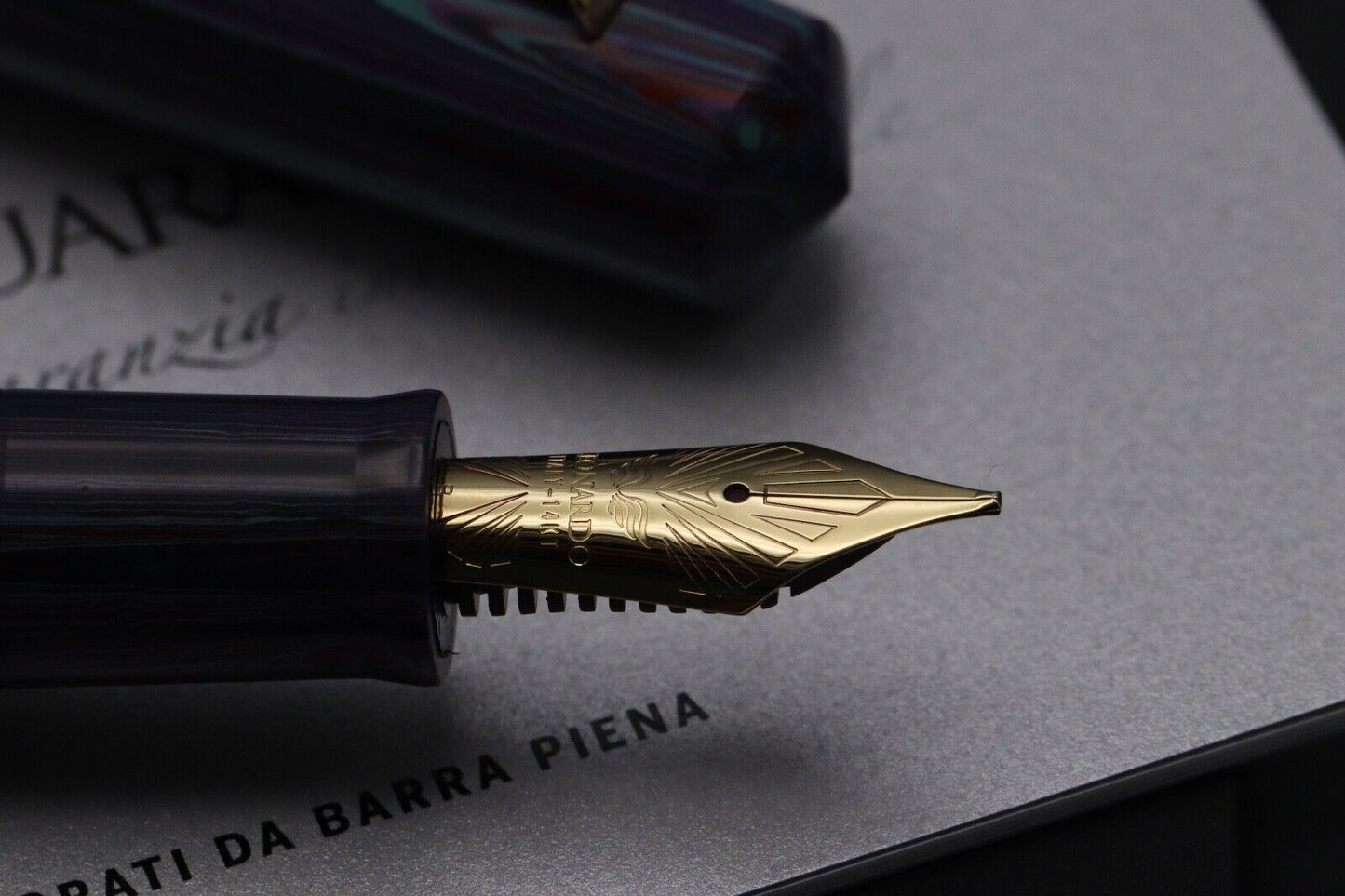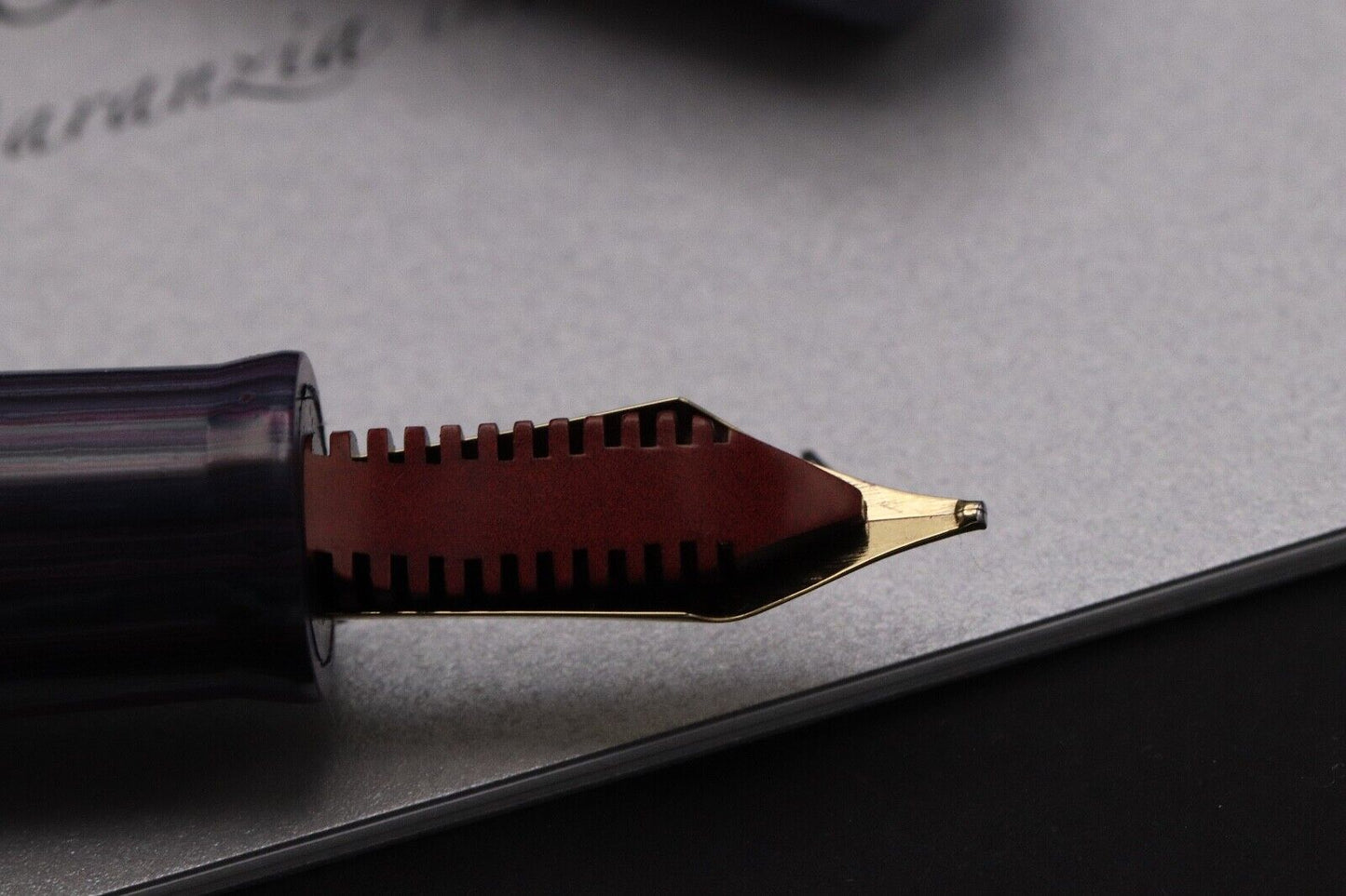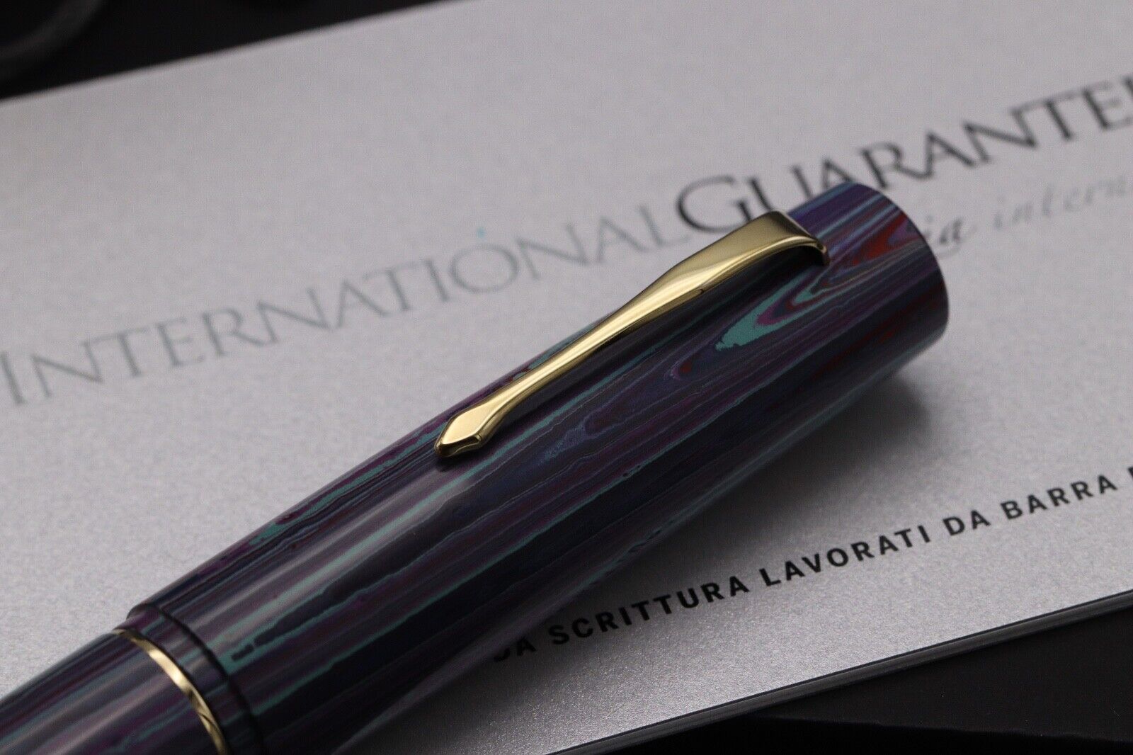 The pen is crafted from a glorious ebonite, whihc features purple, red and blue tones. The trim is gold-plated and it has the 'La Minervina' clip.