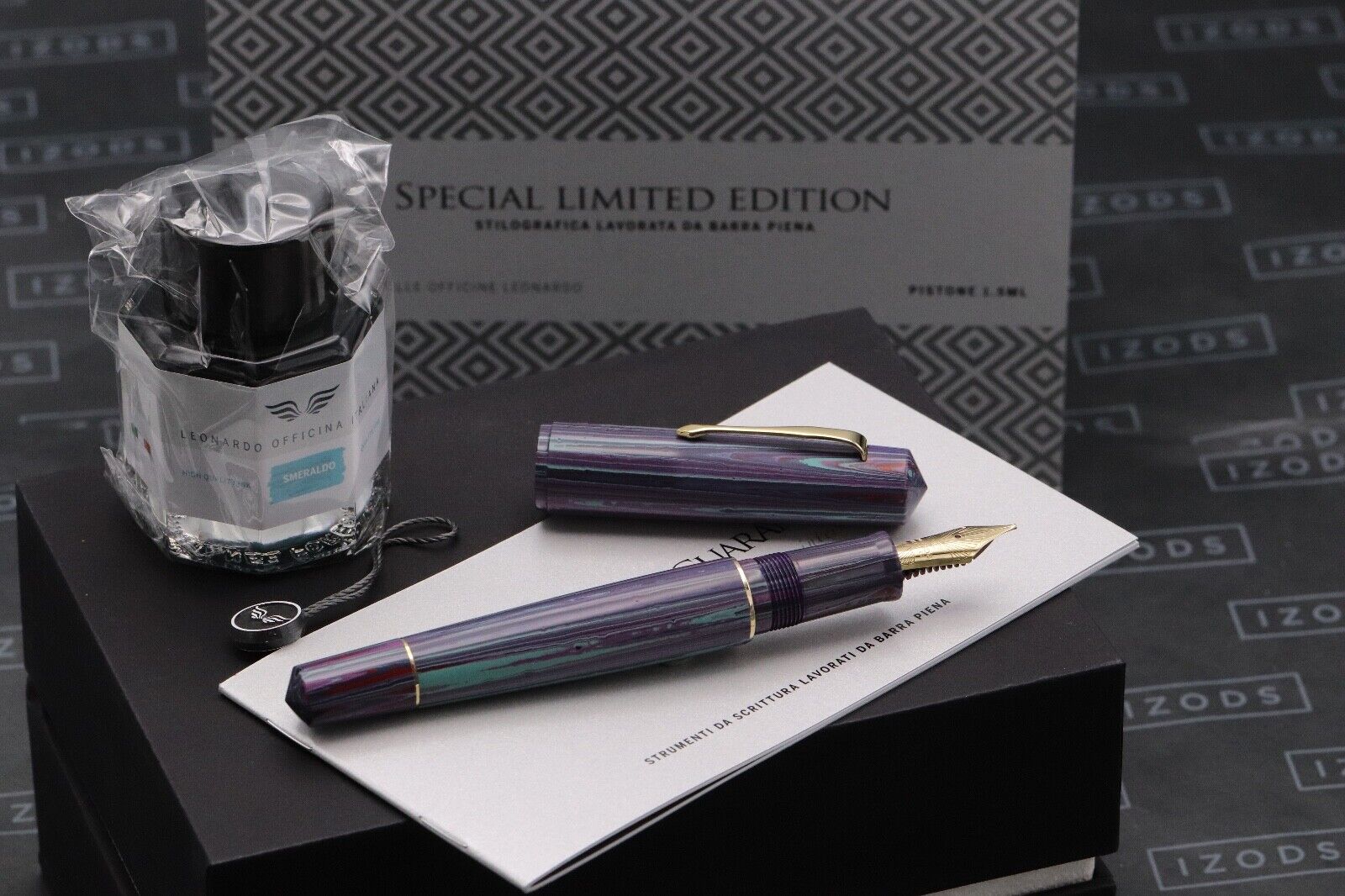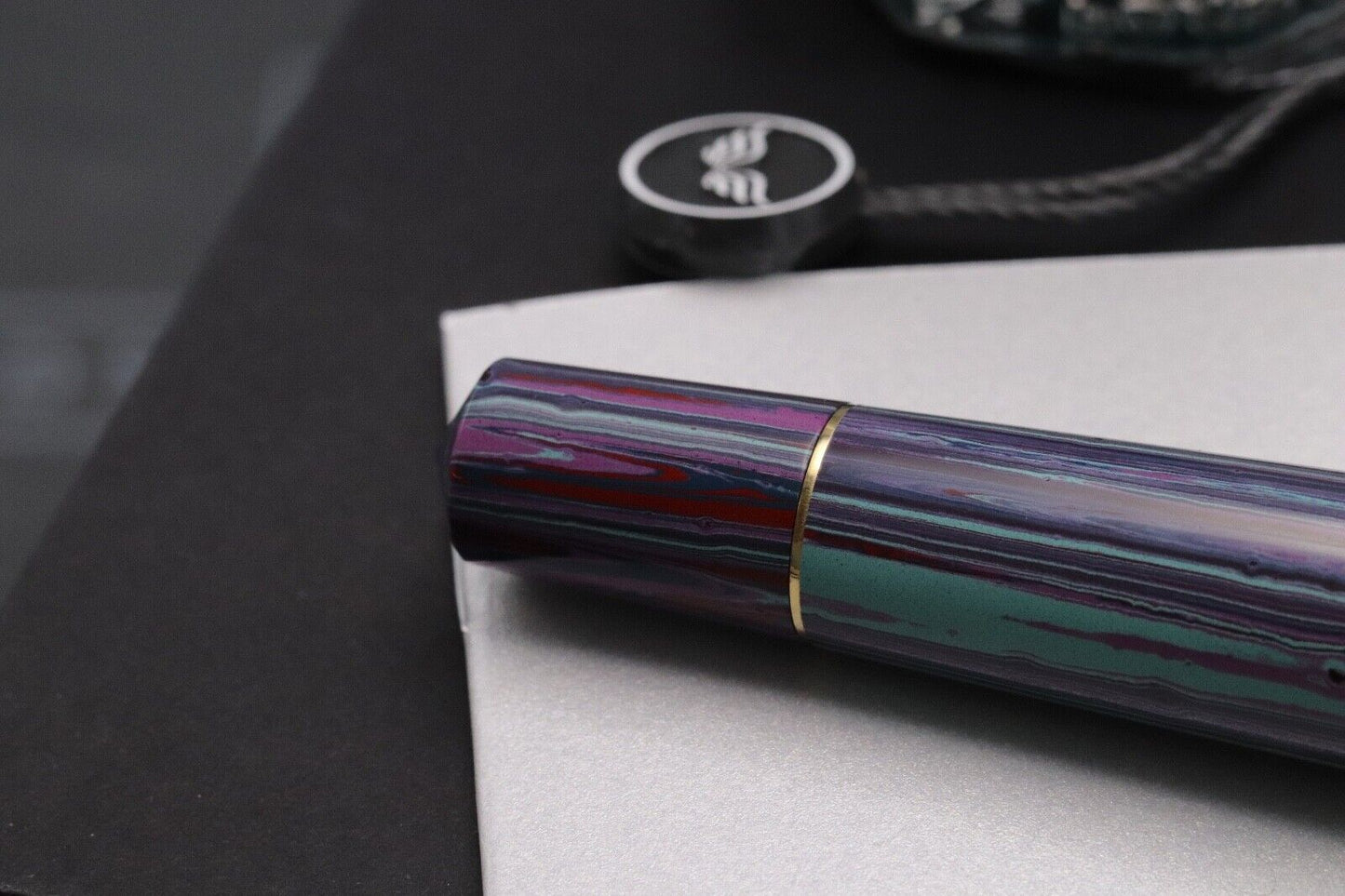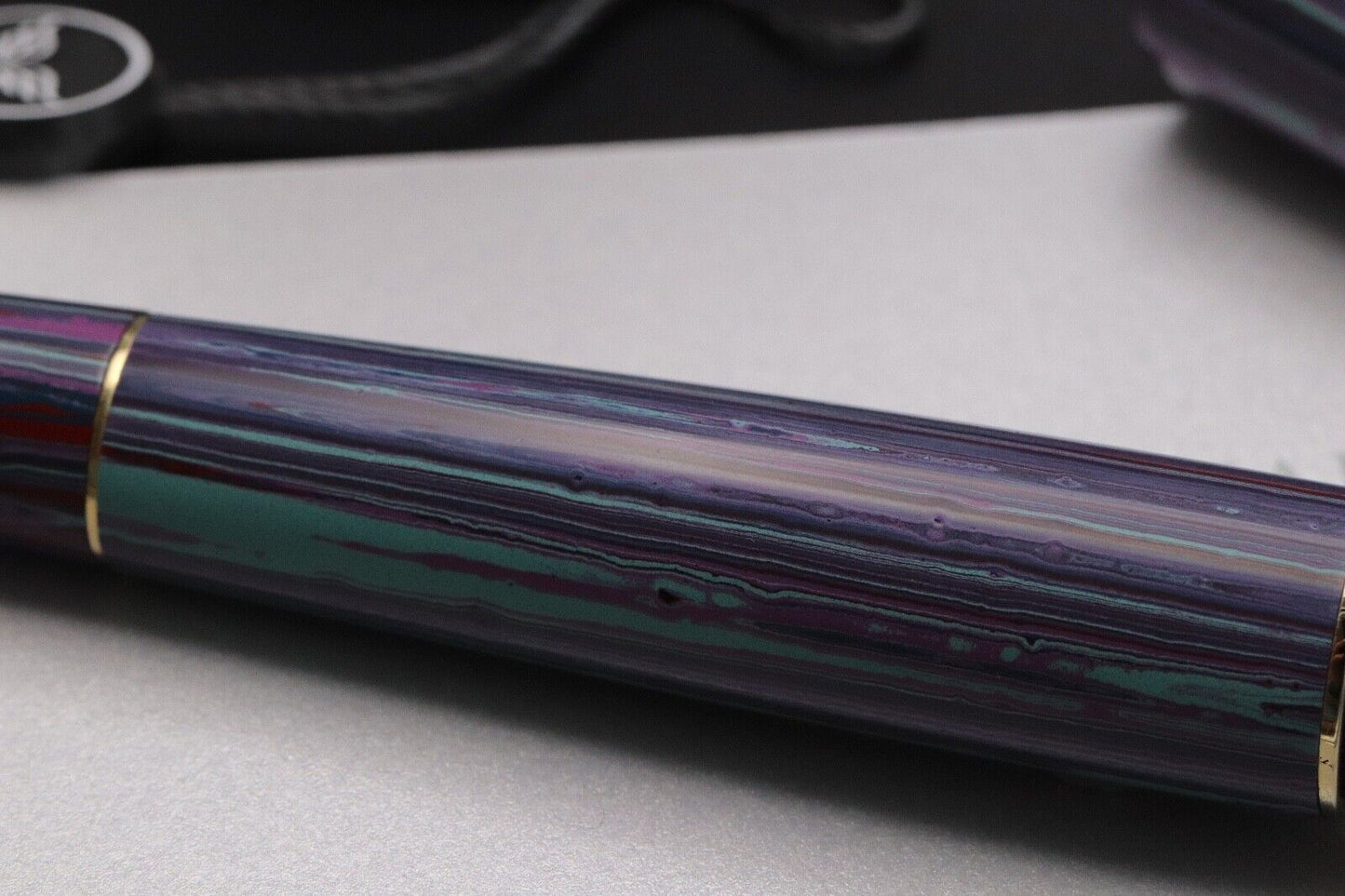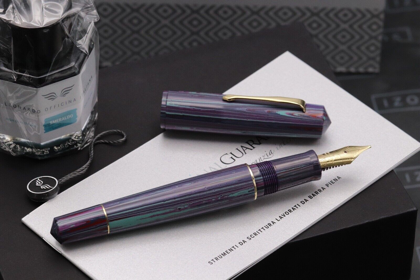 The pen is crafted from a glorious ebonite, whihc features purple, red and blue tones. The trim is gold-plated and it has the 'La Minervina' clip.