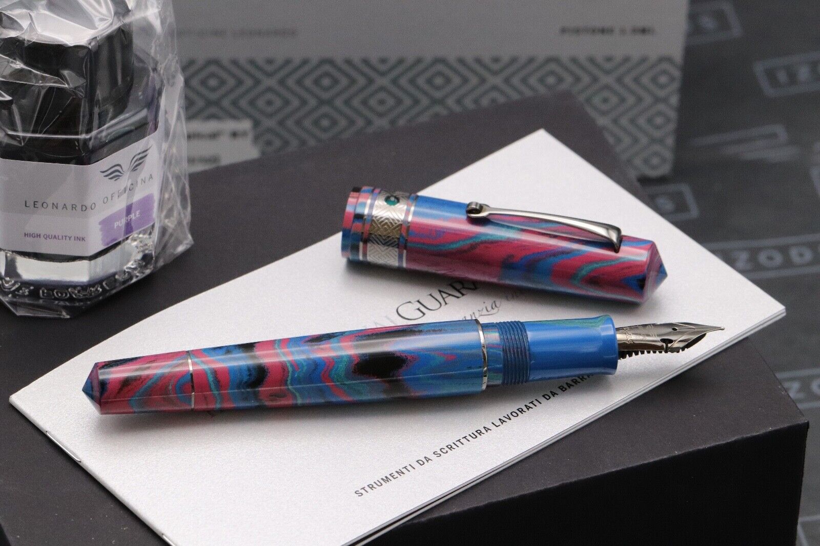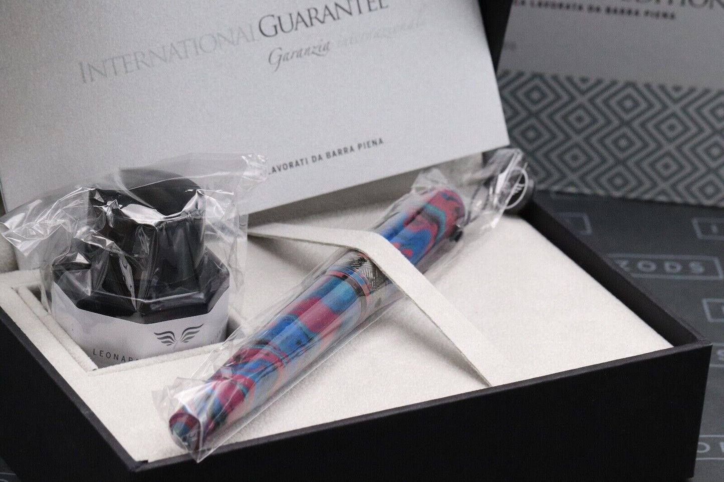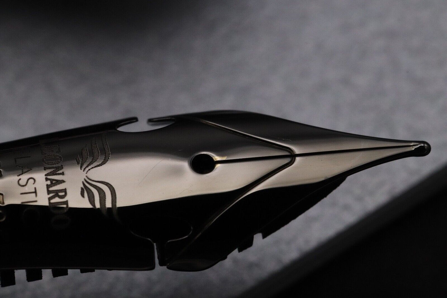 Thanks very much for looking at our listing for this rare Leonardo Supernova Ebonite Tropical Ruthenium Limited Edition Ruthenium Fountain Pen, which comes with its Leonardo presentation box (including outer), bottle of ink and information booklet. The pen has never been used and is presented in virtually as new condition - there is a tiny spot of ruthenium-plating loss on the nib (shown in the photos). Only 12 pens were produced and this is number 12.