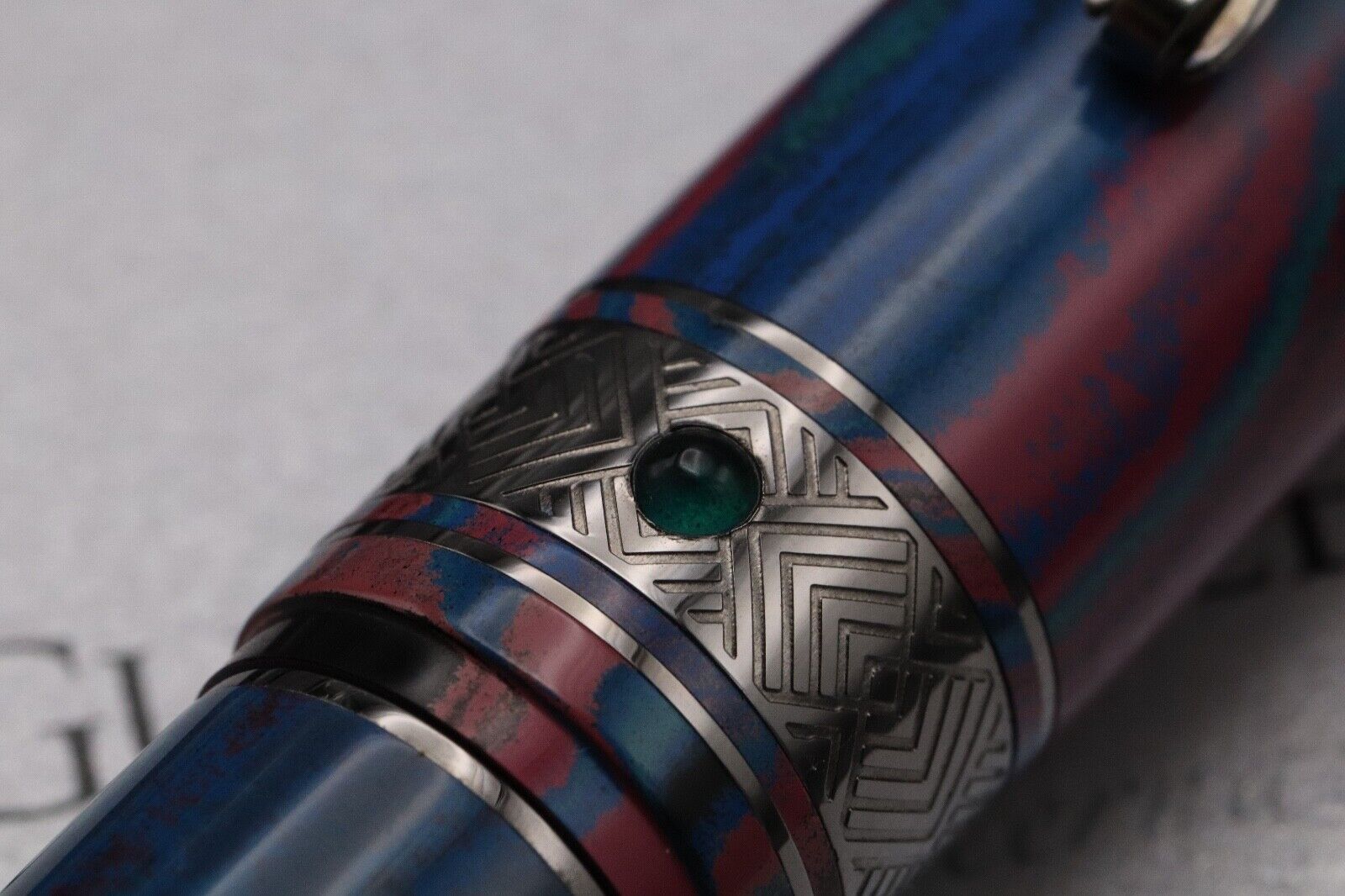 This is an extremely rare version of the Supernova, which was only available directly from Leonardo. The pen is crafted from marbled ebonite, which features myriad of tones. The trim is ruthenium-plated and a emerald cabochon can be found on the central cap ring.