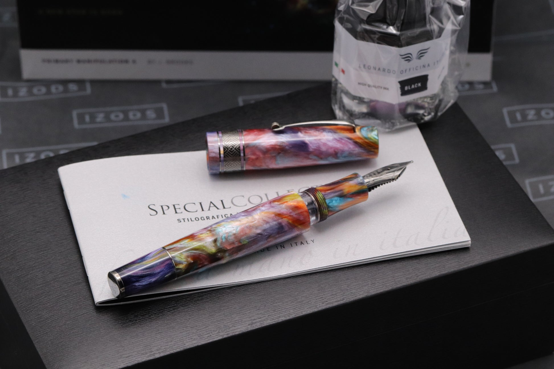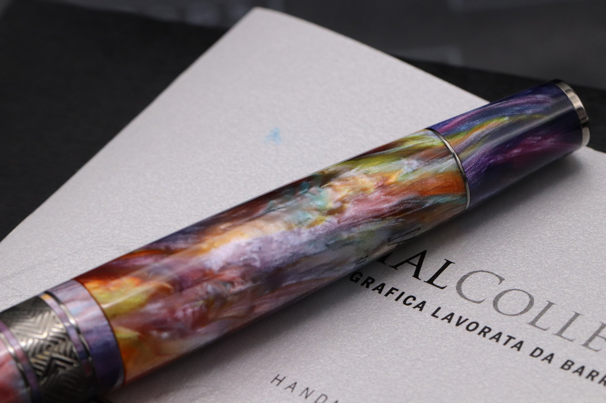 The pen is crafted from Jonathan Brooks legendary Primary Manipulation 4 resin, which features myriad of shimmering tones. The trim is ruthenium-coated.