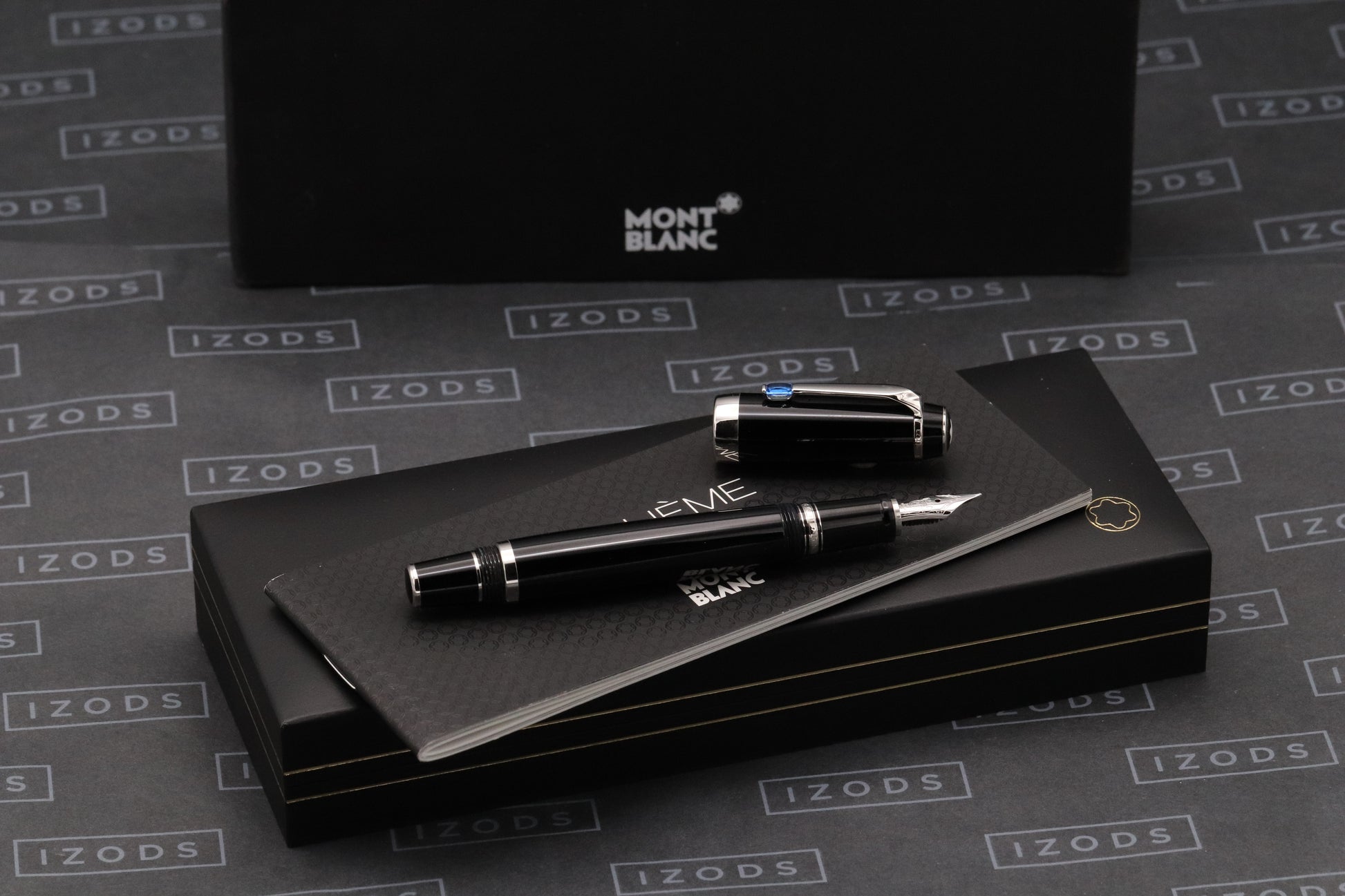 The Boheme fountain pens were available in three sizes - essentially small, medium and large. This is the medium, which was the only one with a fixed, rather than retractable nib. The pen is crafted from black resin with the trim being platinum-coated. The clip features a paramount cut, synthetic blue sapphire.