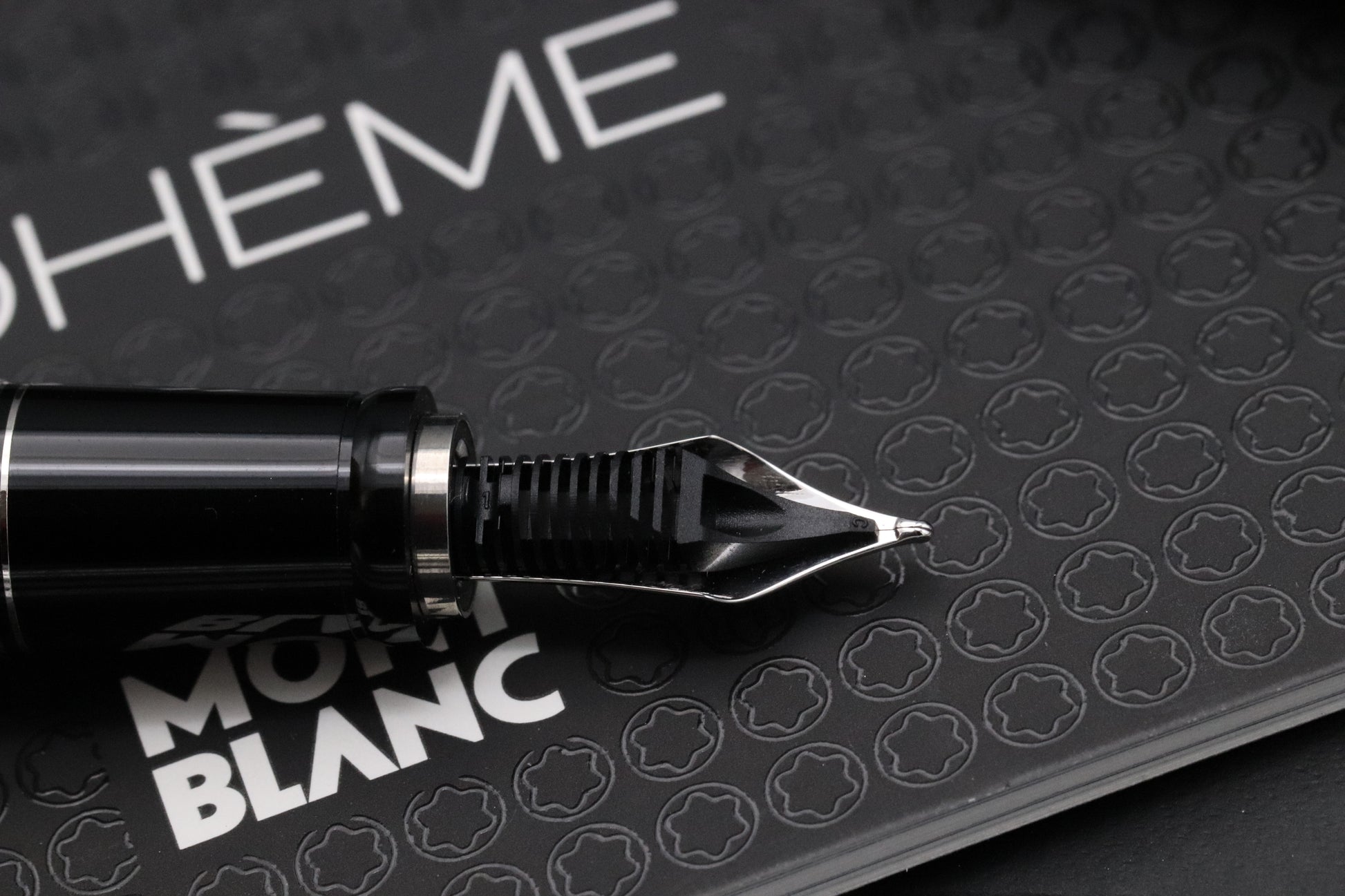 The Boheme fountain pens were available in three sizes - essentially small, medium and large. This is the medium, which was the only one with a fixed, rather than retractable nib. The pen is crafted from black resin with the trim being platinum-coated. The clip features a paramount cut, synthetic blue sapphire.