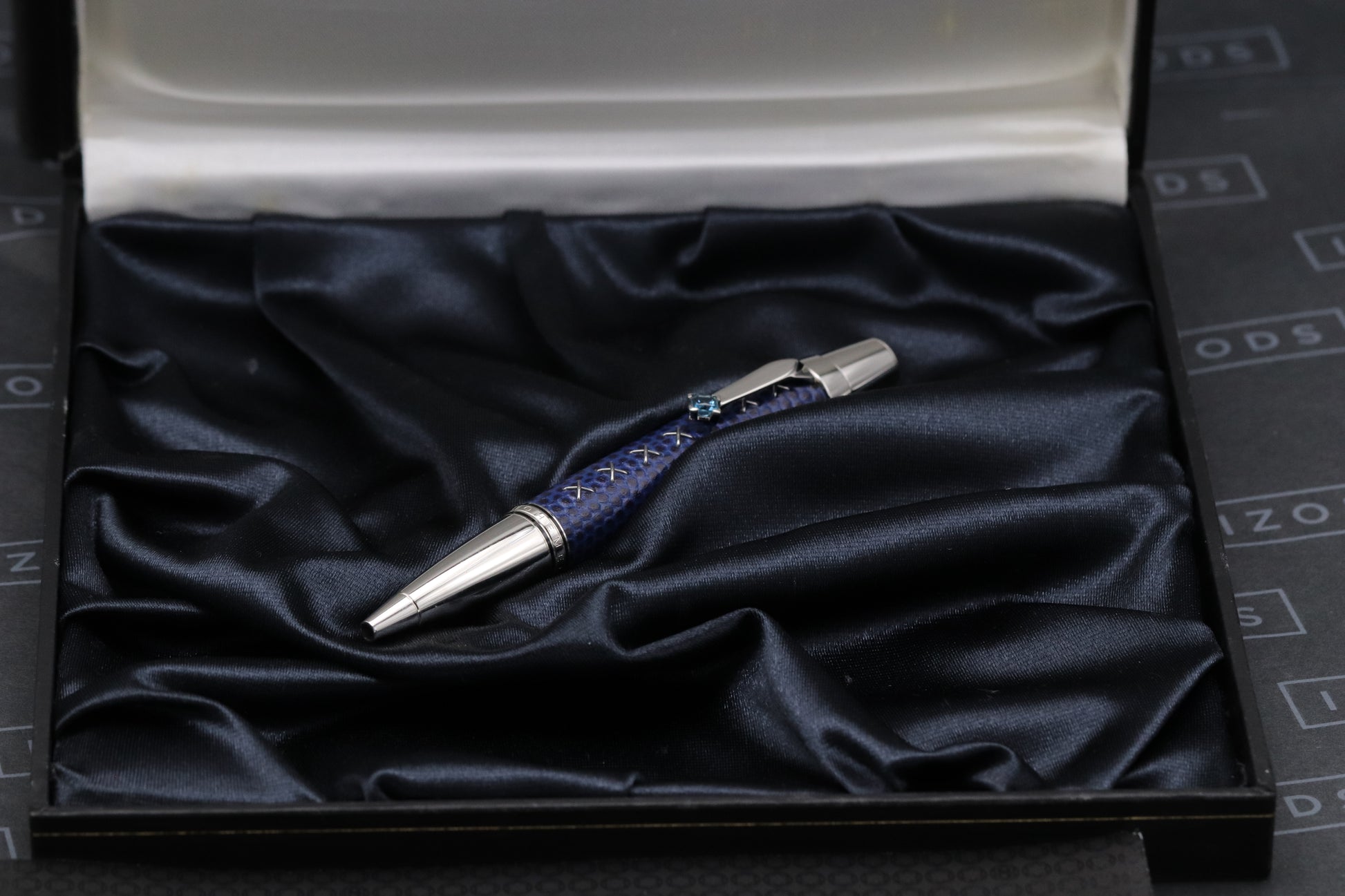 The Jewels Topaz was originally launched in 2004 and it features a vibrant blue calfskin barrel, with platinum-plated stitching. The trim and section are platinum plated and the clip features a synthetic princess cut topaz.