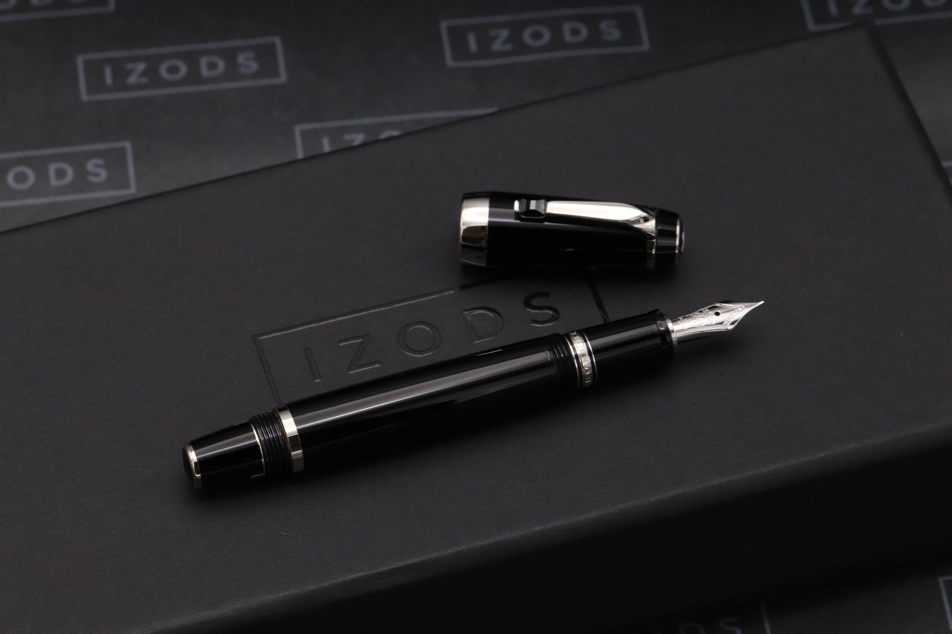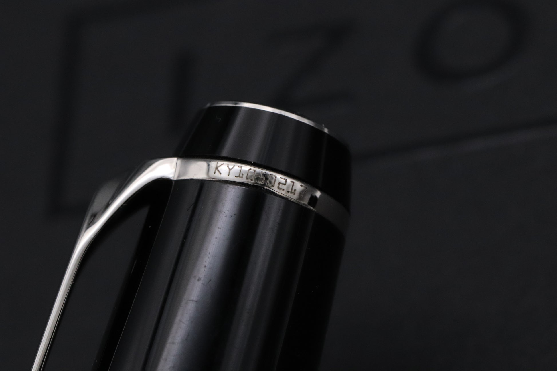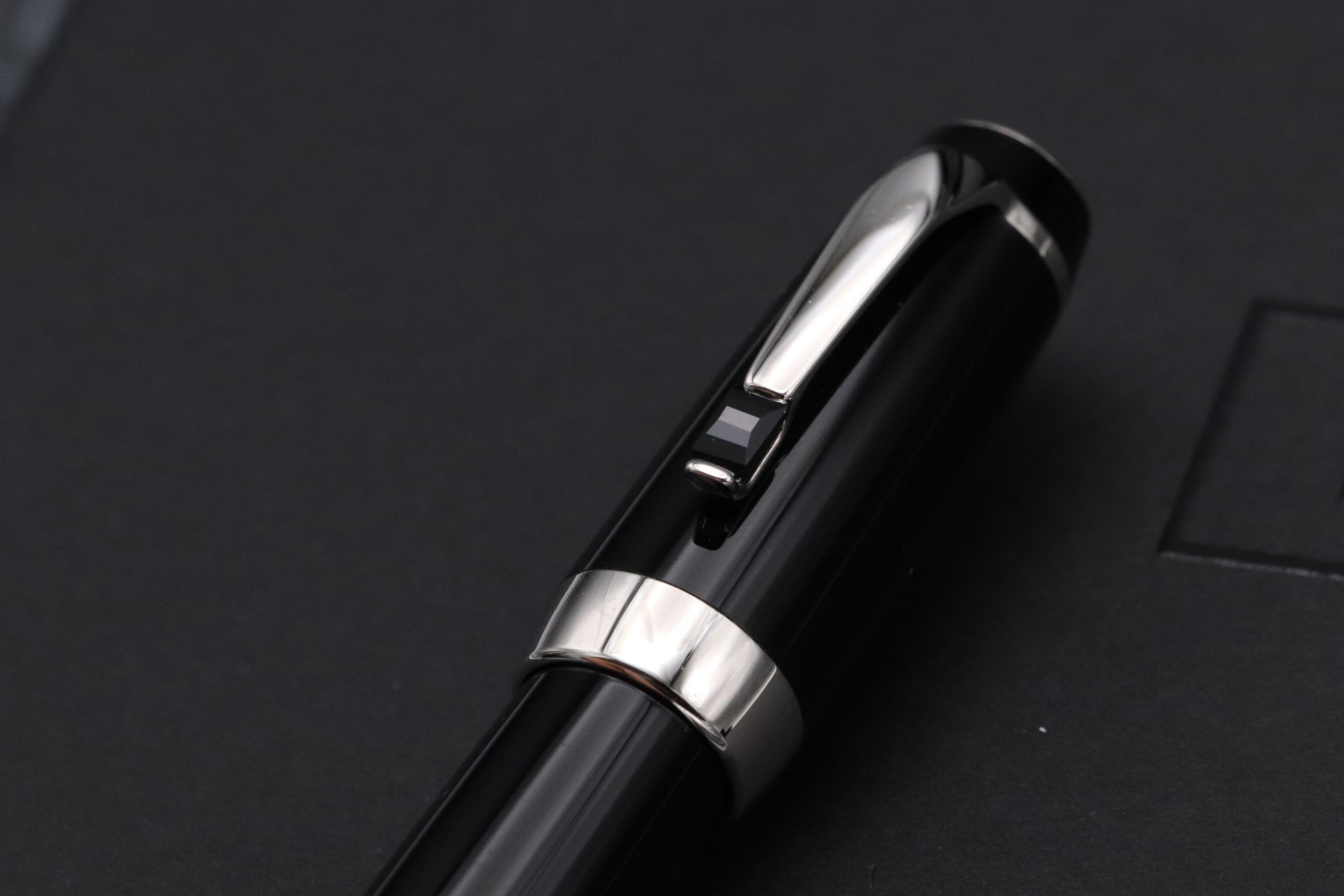 The Noir features a synthetic, paramount cut, onyx gemstone on the clip. The pen is fitted with a 14k extra fine nib and both Germany and serial number markings can be found on the clip ring.