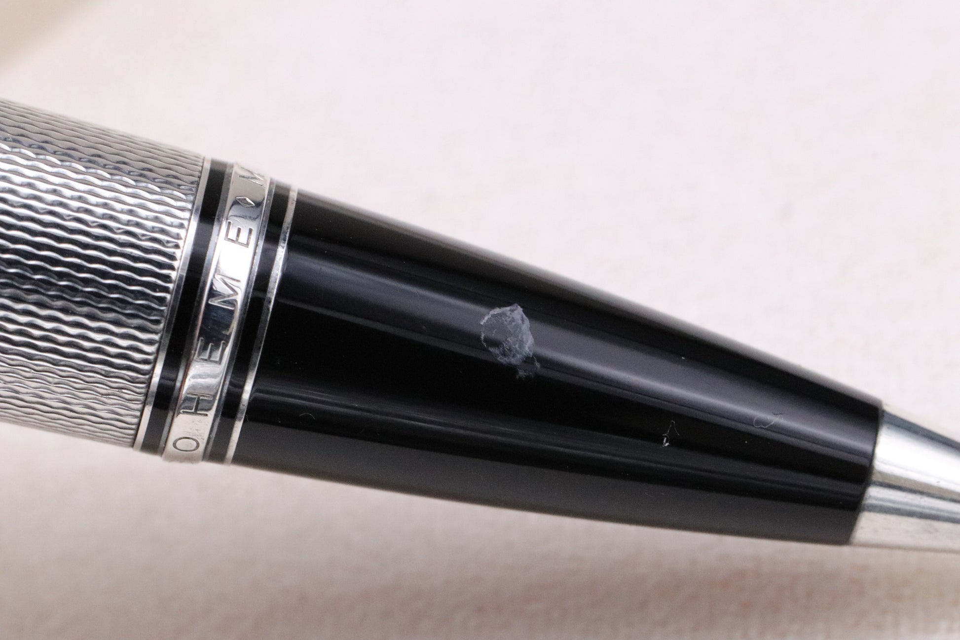 One of our favourite elements is the green resin barrel, which has black and white flecks. The cap top and cone are crafted from black resin, with the trim being vermeil (gold-plated over sterling silver).