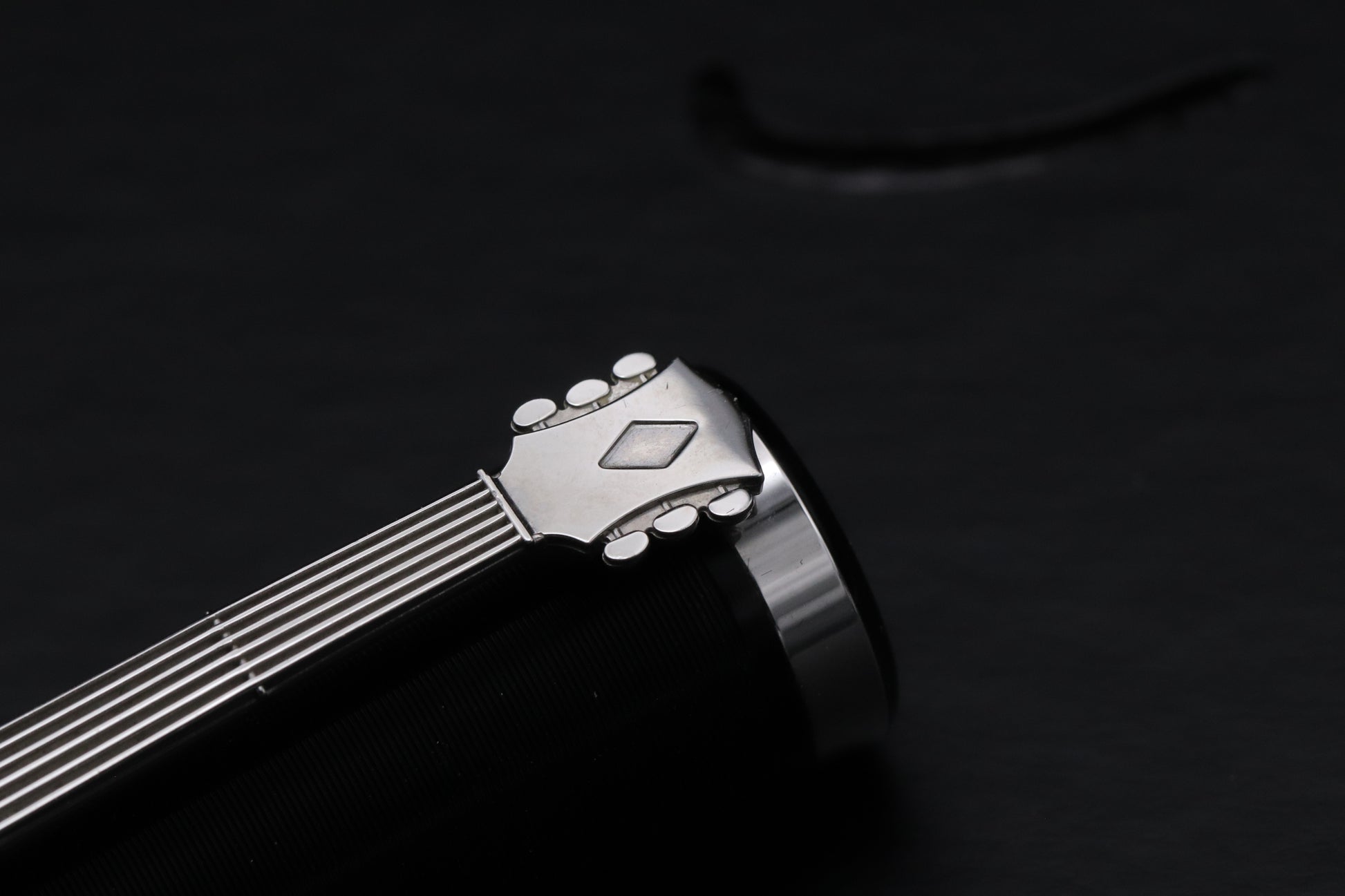 The clip is platinum plated and is designed to resemble the neck of a guitar. The pen is then completed with an engraved self-portrait of John Lennon and the Montblanc emblem on the cap.