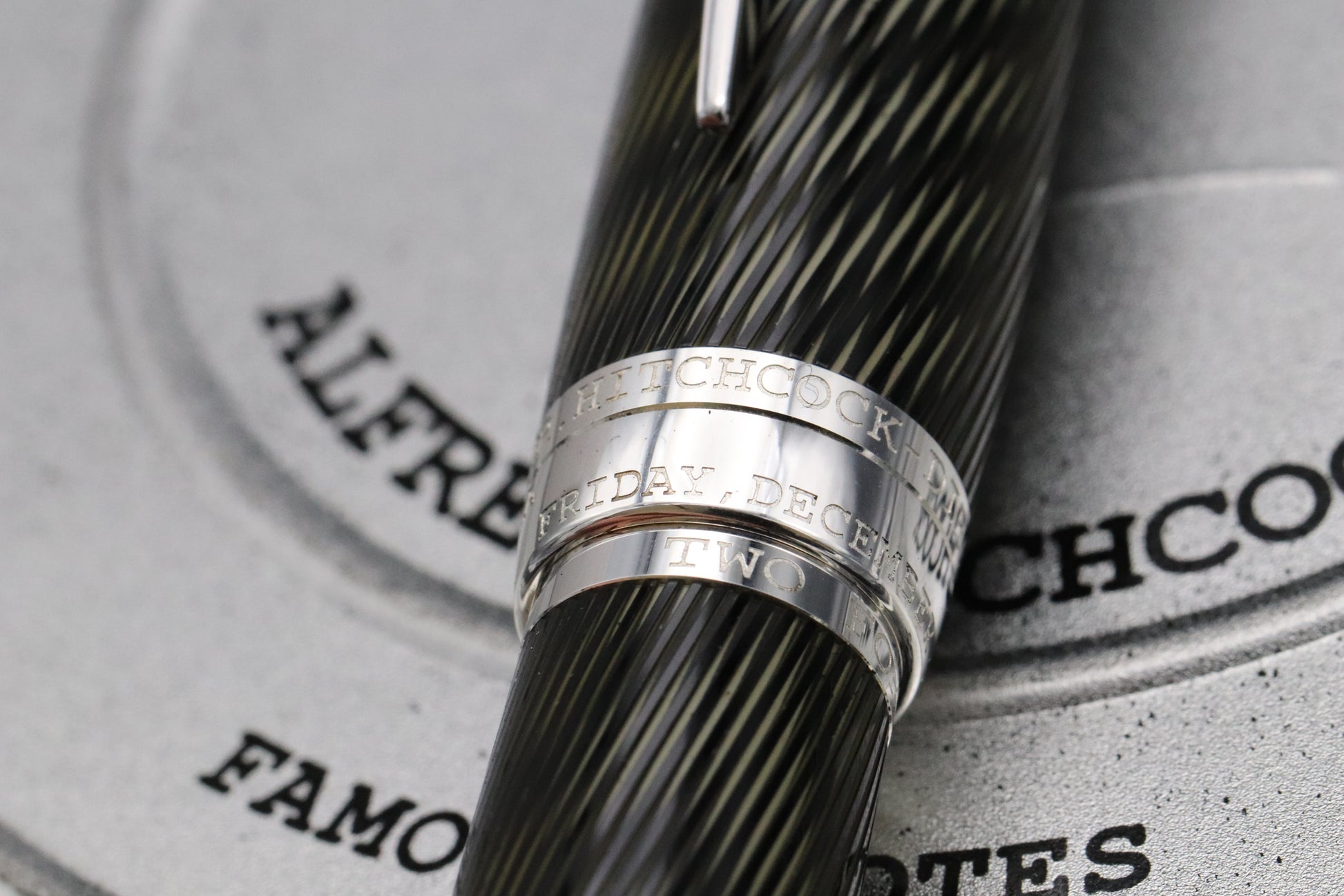 The cap and barrel are finished with a twisting effect, which alludes to the dizzying effect of the staircase in the film “Vertigo”. The stainless steel clip is knife-shaped as a nod to “Psycho” and one the cone can be found 53 hatch marks, marking the 53 films that Hitchcock dirtected. The notes on the cap and barrel refer to the original ‘Psycho’ film reel. The trim is sterling silver.