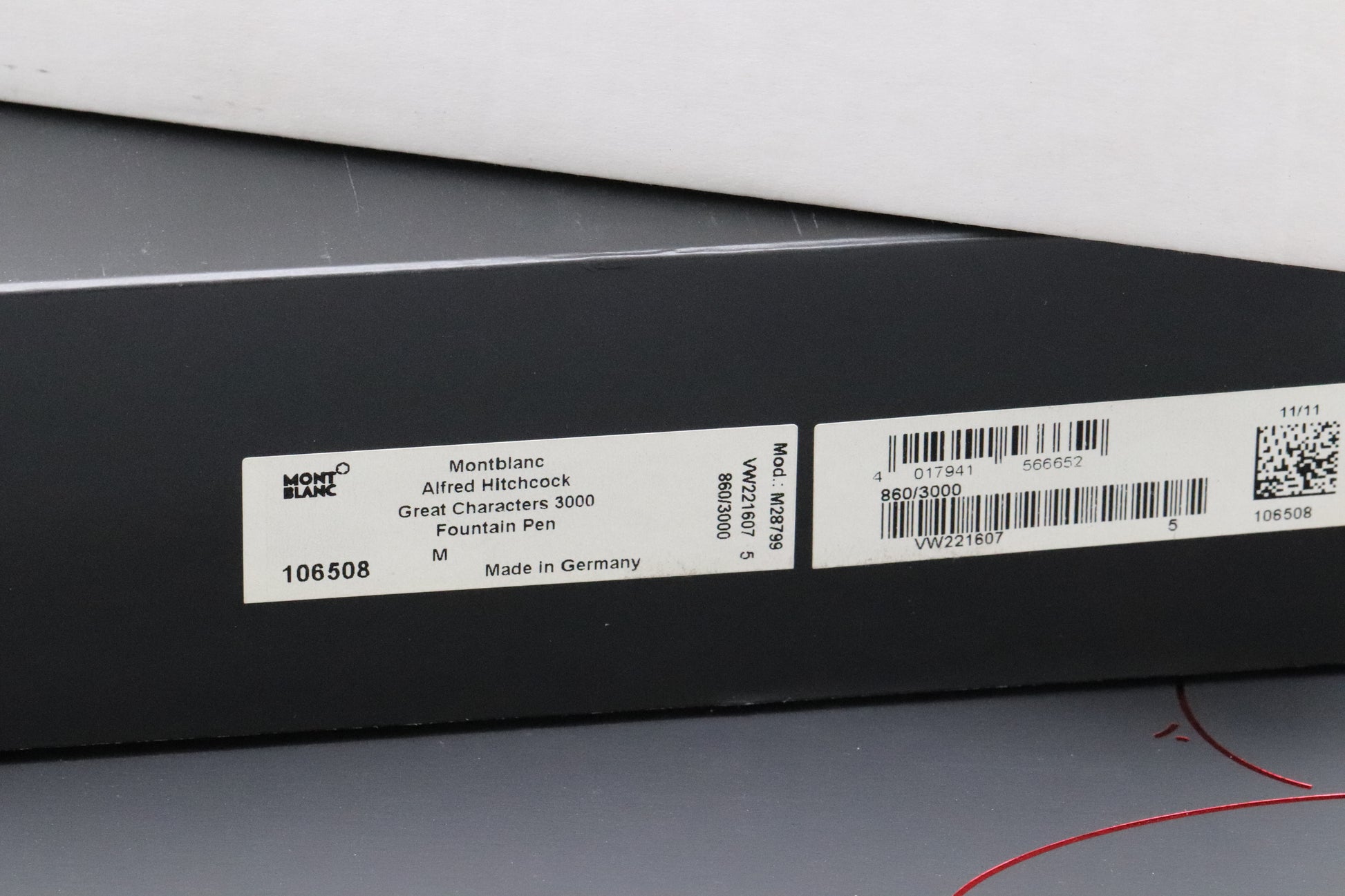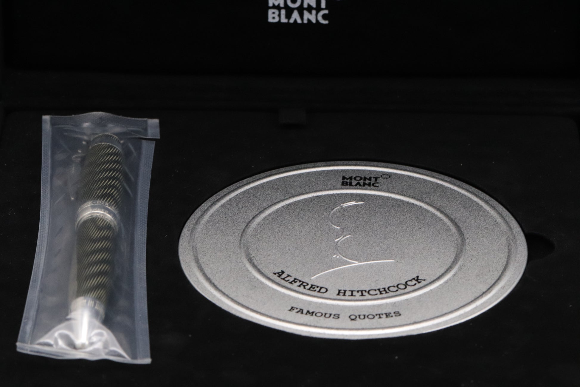 Thanks very much for looking at our listing for this delightful Montblanc Great Characters Alfred Hitchcock 3000 Limited Edition Fountain Pen, which comes with its large Montblanc presentation box (including outers), film reel case and booklet. The pen has barely been used and is presented in wonderful condition - up until just a few months ago, the pen remains sealed in its factory pouch. Only 3000 examples were produced and this is number 0860.