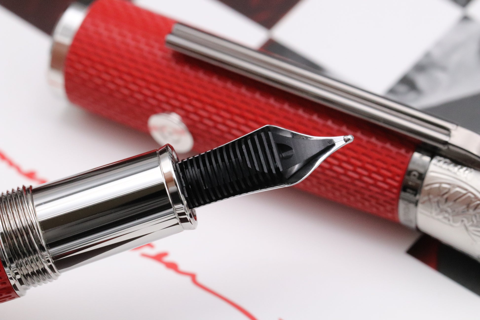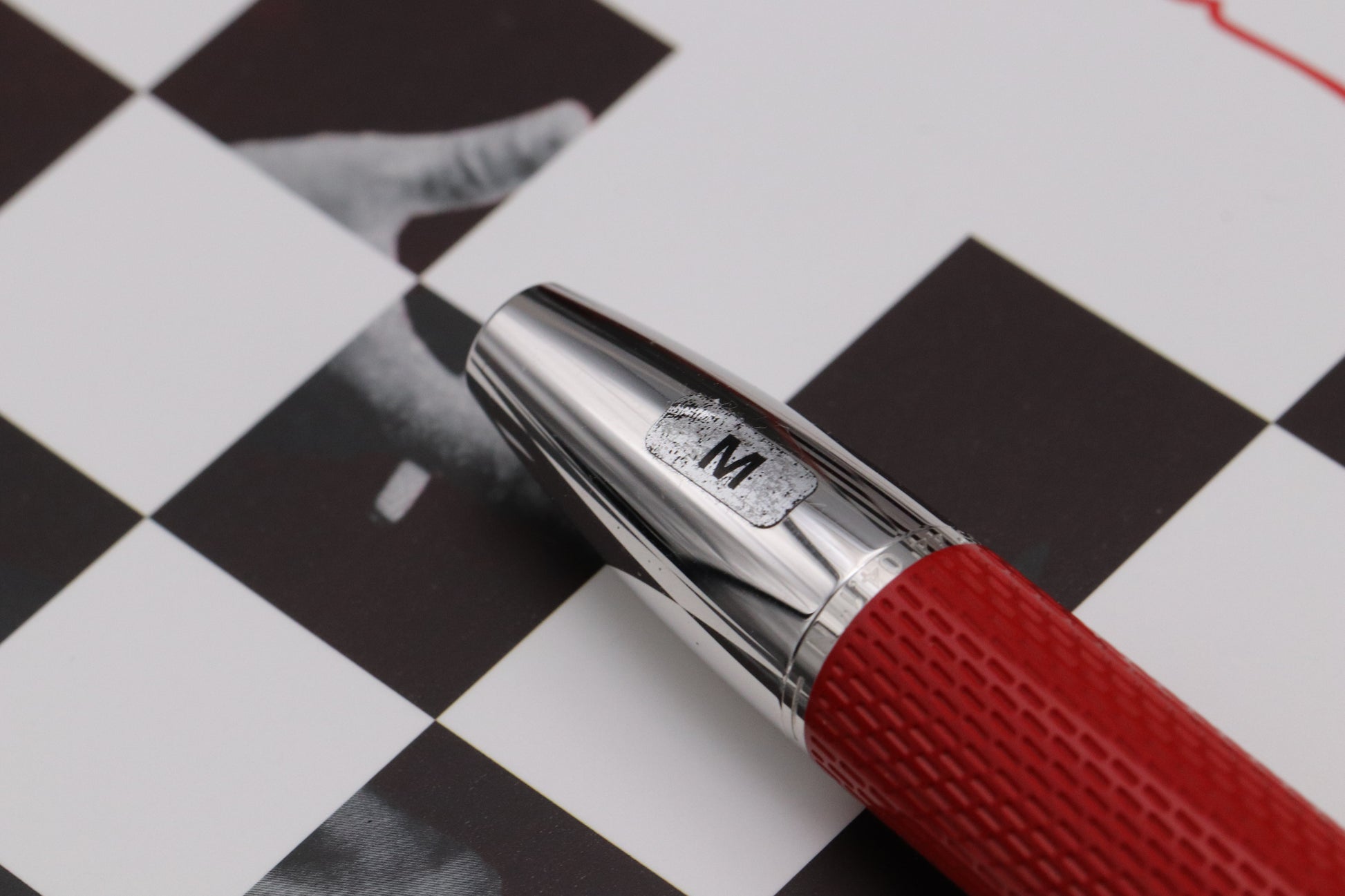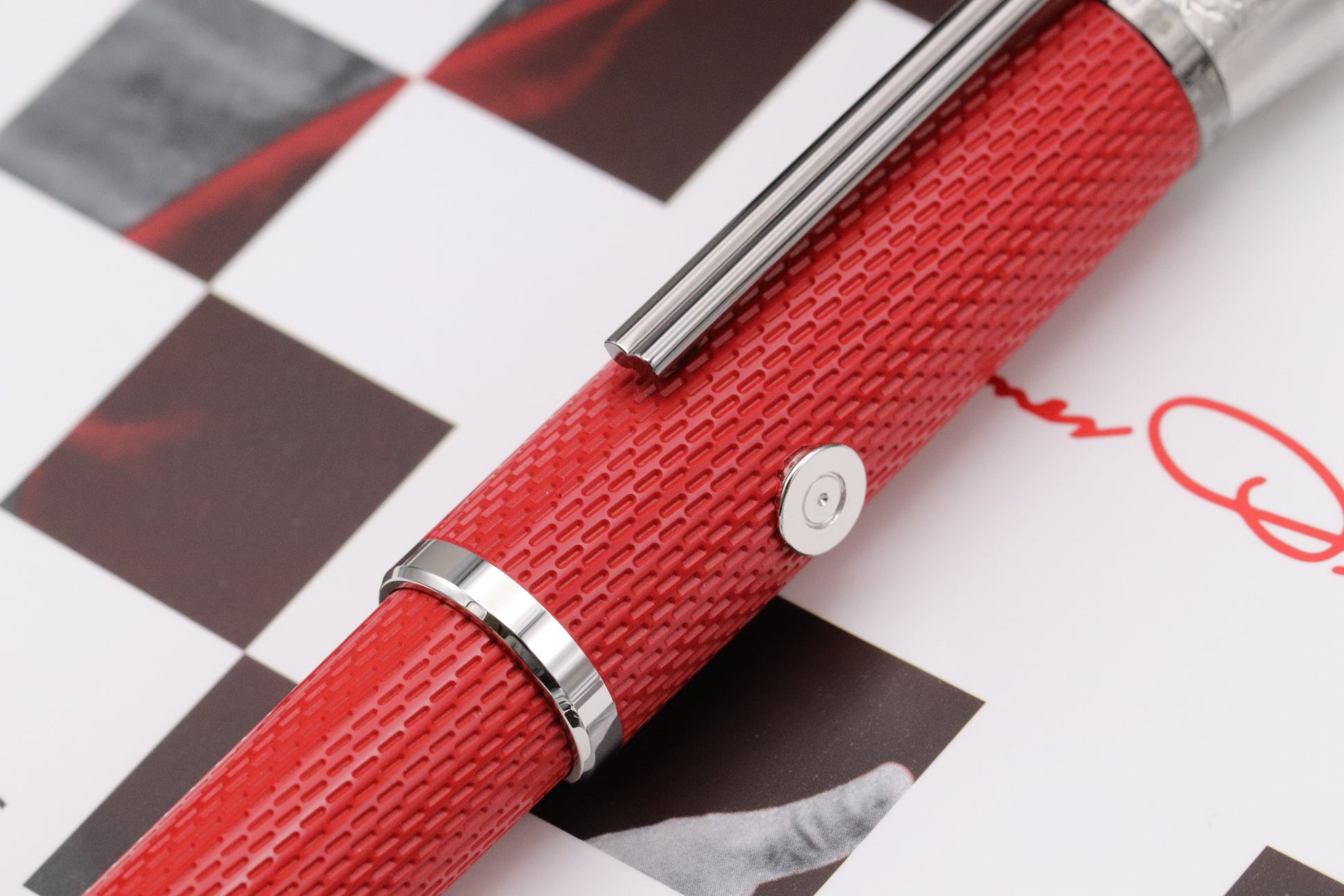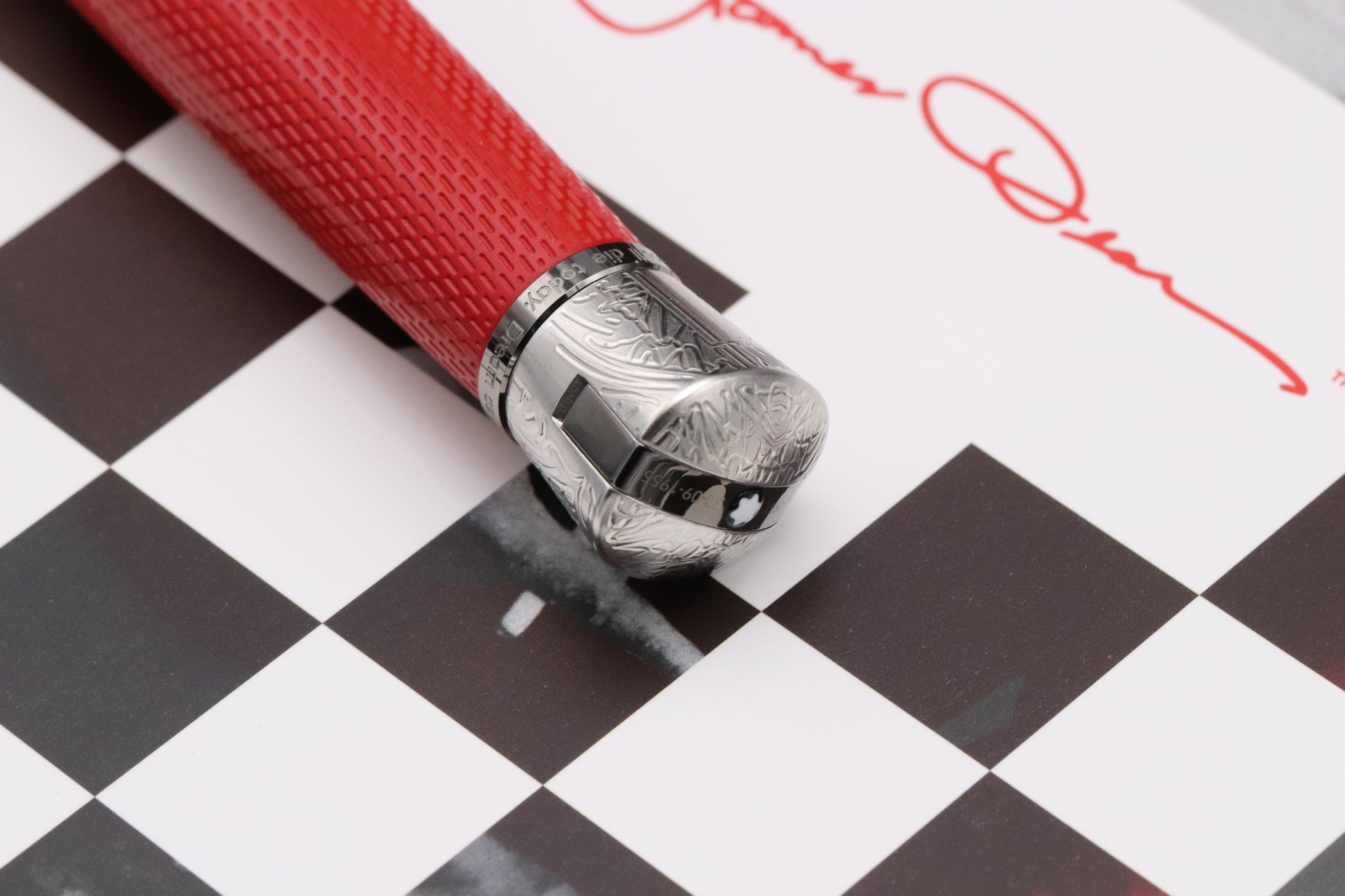 The colour scheme is inspired by the red leather jacket worn by Dean in the film "Rebel Without a Cause", with the engraved pattern reflecting the jeans he also wore. The clip is gun-shaped, which is nod to the famous scene in the film "Giant". The cap ring is engraved wth the words, "Dream as if you'll live forever. Live as if you'll die today".