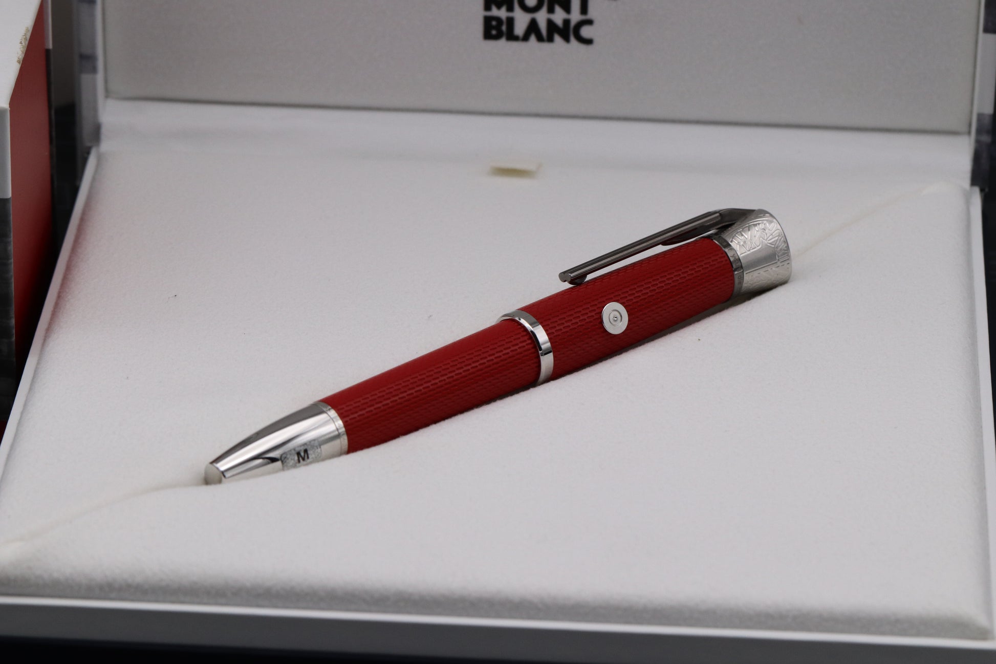 Thanks very much for looking at our listing for this Montblanc Great Characters James Dean Special Edition Fountain Pen, which comes with its large Montblanc presentation box (including outer) and information booklet - the back page appears to have been removed. Also included is a 50ml bottle of the Montblanc James Dean ink. The pen has never been used and is presented in virtually as new condition - the M sticker, denoting a medium nib, remains on the cone.