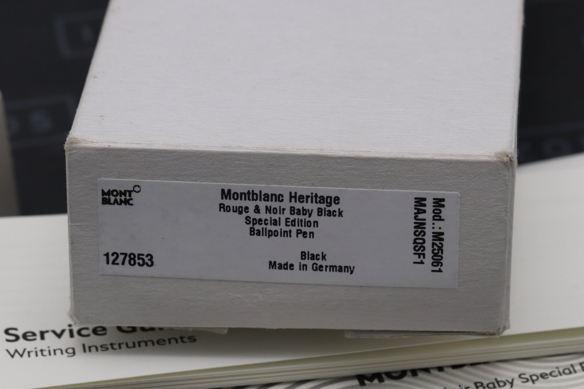 Thanks very much for looking at our listing for this Montbanc Heritage Rouge et Noir Baby Black Ballpoint Pen, which comes with its Montblanc presentation box (including outer), soft pouch and unstamped booklet. The pen has never been used and is presented in virtually as new condition.