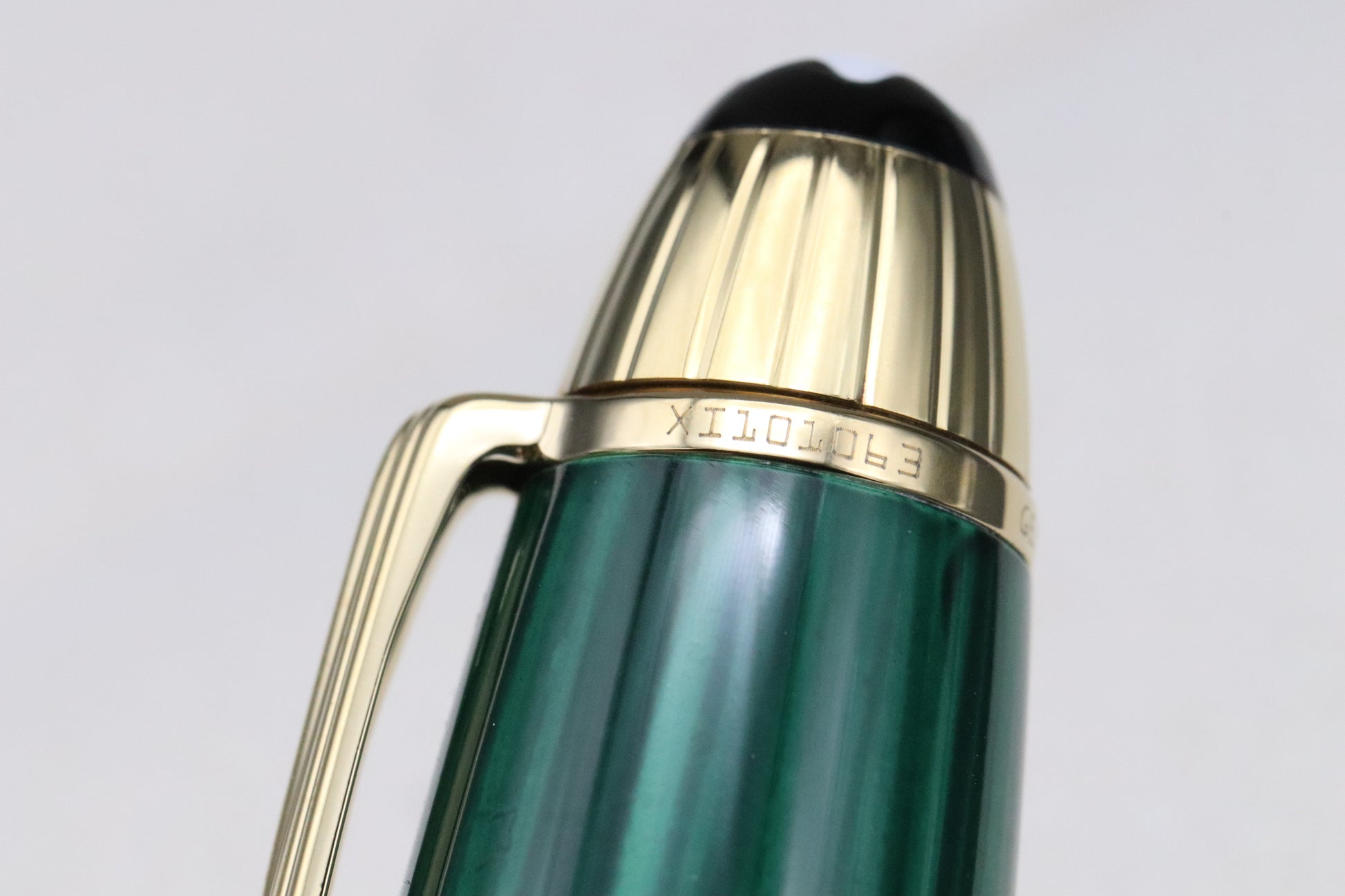 They were available in two versions, vermeil and platinum plated. This is the vermeil (gold-plating over sterling silver) version and when contrasted with the vibrant green malachite cap, it really is a very striking writing instrument. Malachite was chosen for this pen because it was the stone of the Russian Czars. The clip is gold-plated.The appropriate Germany and serial number markings can be found on the clip ring.