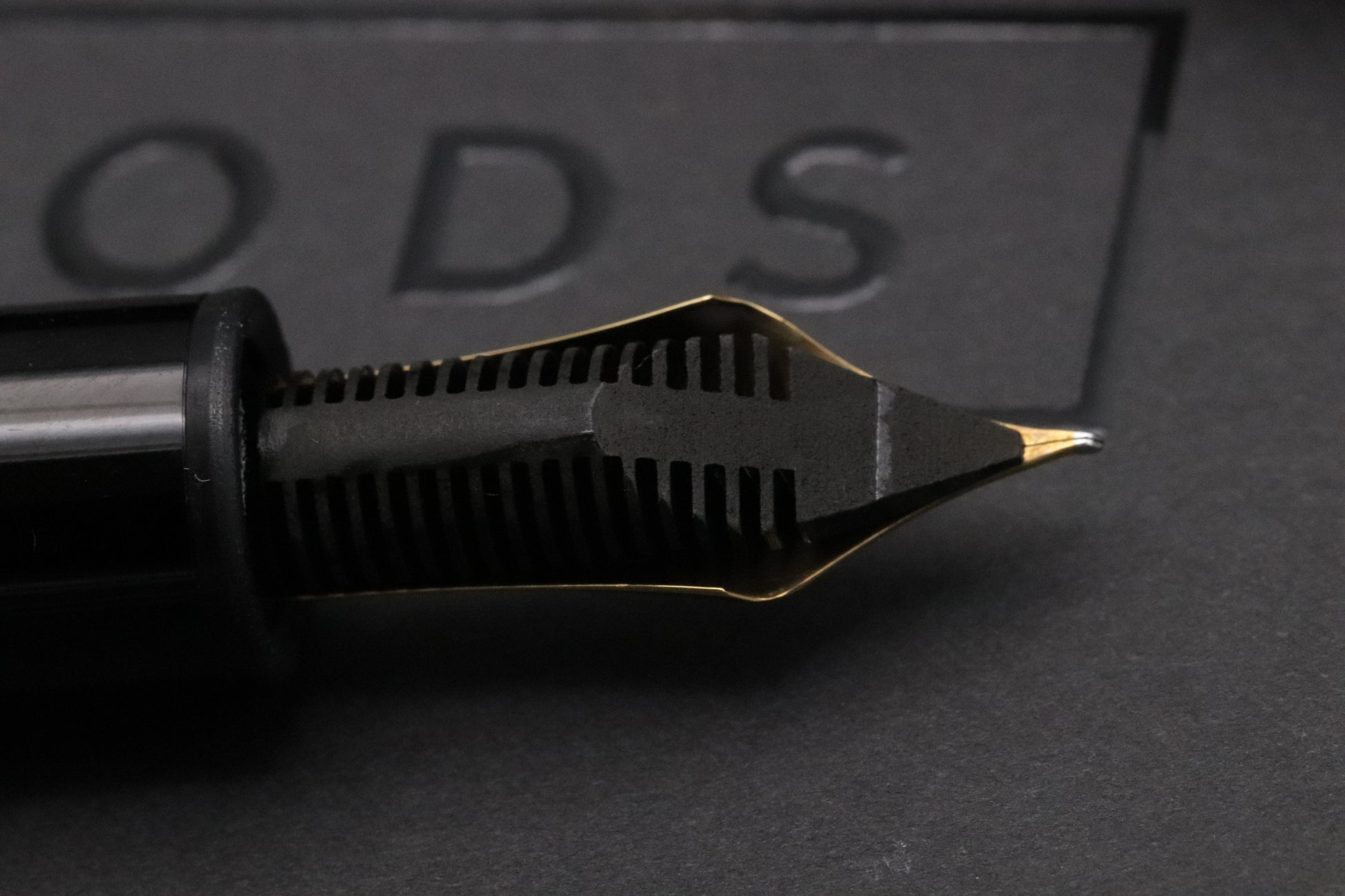 The pen is crafted from black resin with the trim being gold-coated. This is a relatively easy pen to date, as it has a early style plastic feed, two-piece barrel, brass piston threads and bi-tone 18k nib. These features coupled with the very first-generation serial number (shorter and in a different font - numbers only), dates this to 1991.
