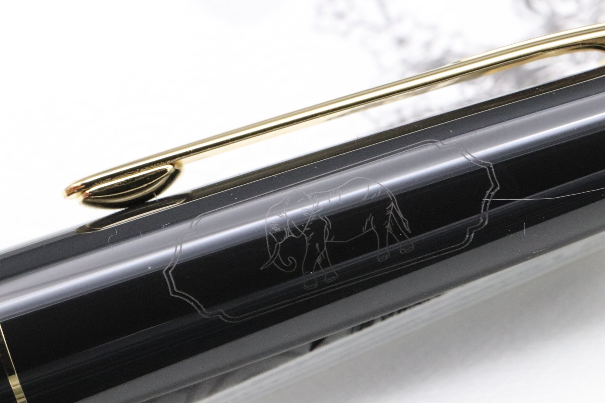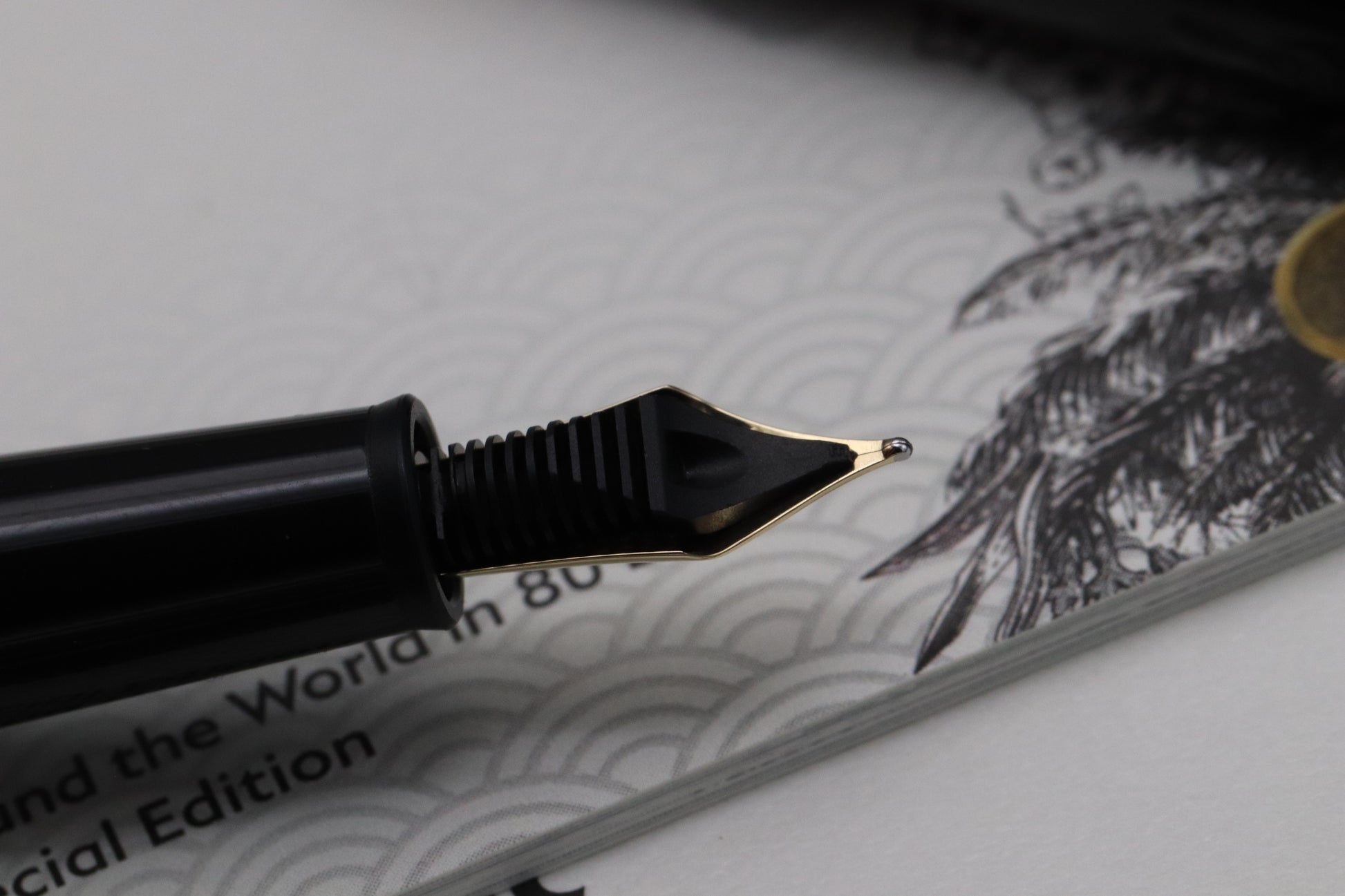 The pen is crafted from an anthractive resin and this model takes inspiration from the second part of his journey. Riding an elephant, he travelled from Bombay to Yokahama in 25 days. The cone is engraved with a pattern inspired by Princess Aouda's jewellery, with the clip featuring a lacquered diamond suit casrd. The cap features a laser engraved elephant cartouche.