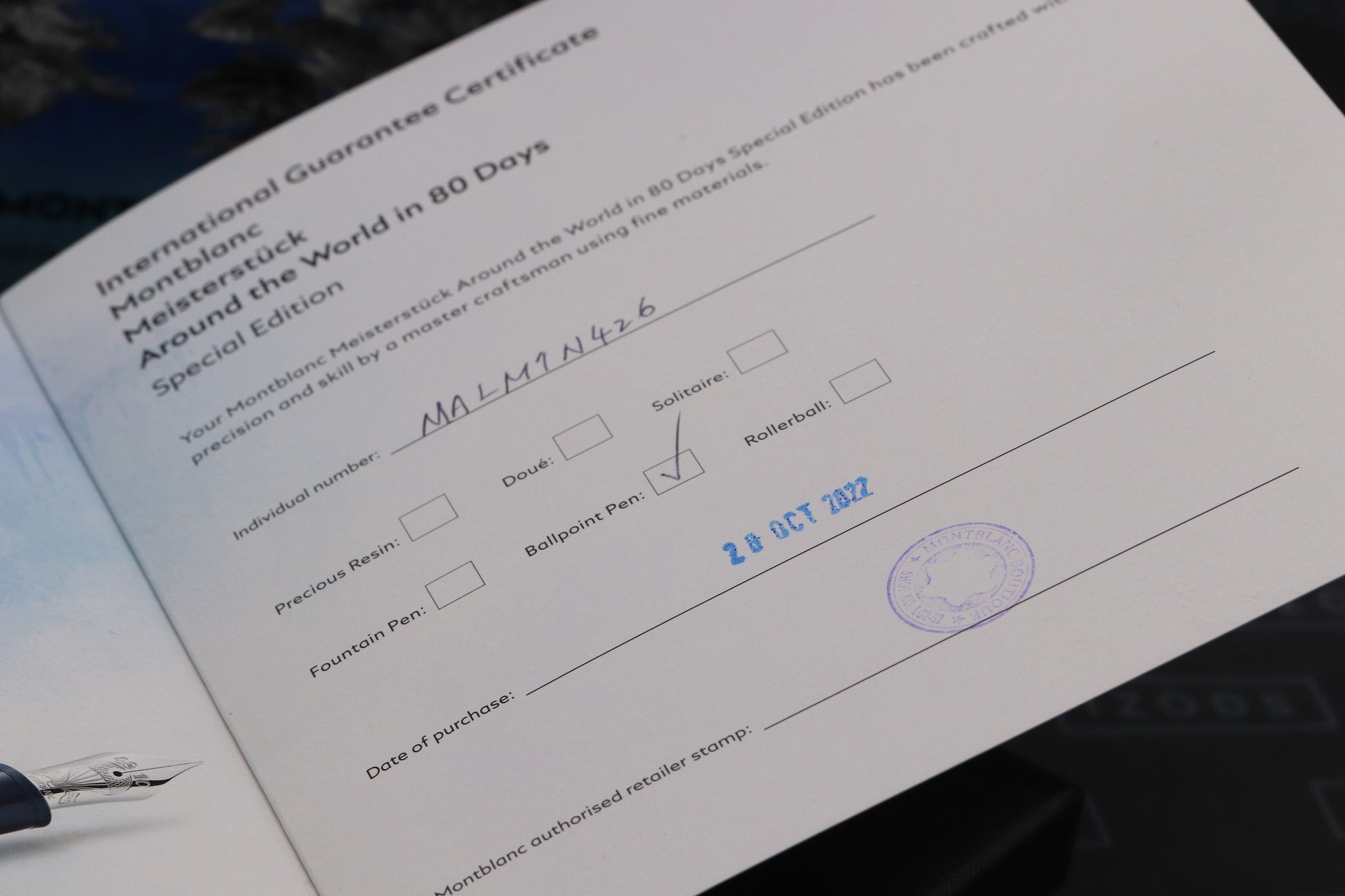 Thanks for looking at our listing for this Montblanc Meisterstuck Midsize Around the World in 80 Days Ballpoint Pen, which comes with its Montblanc presentation box (including outers) and stamped booklet - confirming first purchase on 28th October 2022. The pen has been very lightly used and is presented in overall fantastic condition.