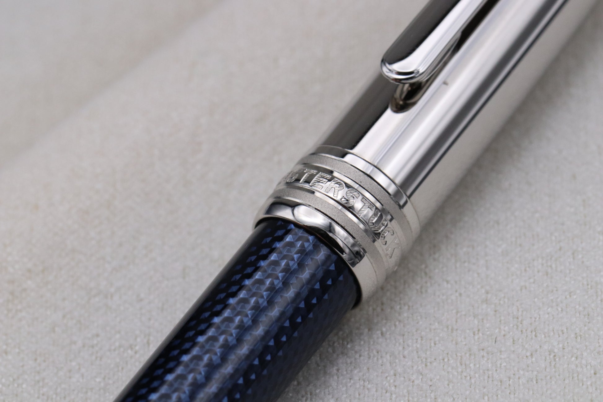 The inspiration for the Blue Hour range came from the magical hour between daylight and night. The lacquered barrel features a hexagonal pattern, which is designed to reflect the refration of lights and night-time traffic in cities. The cap is crafted from stainless steel with the trim being platinum-plated.