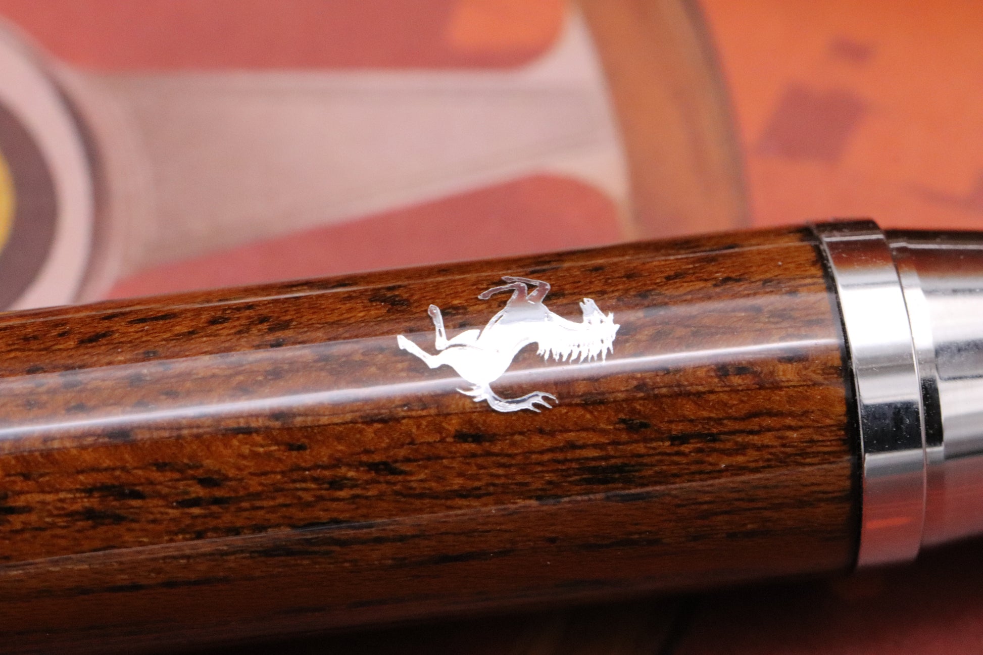 The cap and barrel are crafted from sapeli wood, with a black lacquer insert running the length of the pen. The iconic Ferrari prancing horse sits proudly on the barrel. The trim is platinum-coated and the Montblanc snowcap sits atop the cap, gleaming in yellow resin.