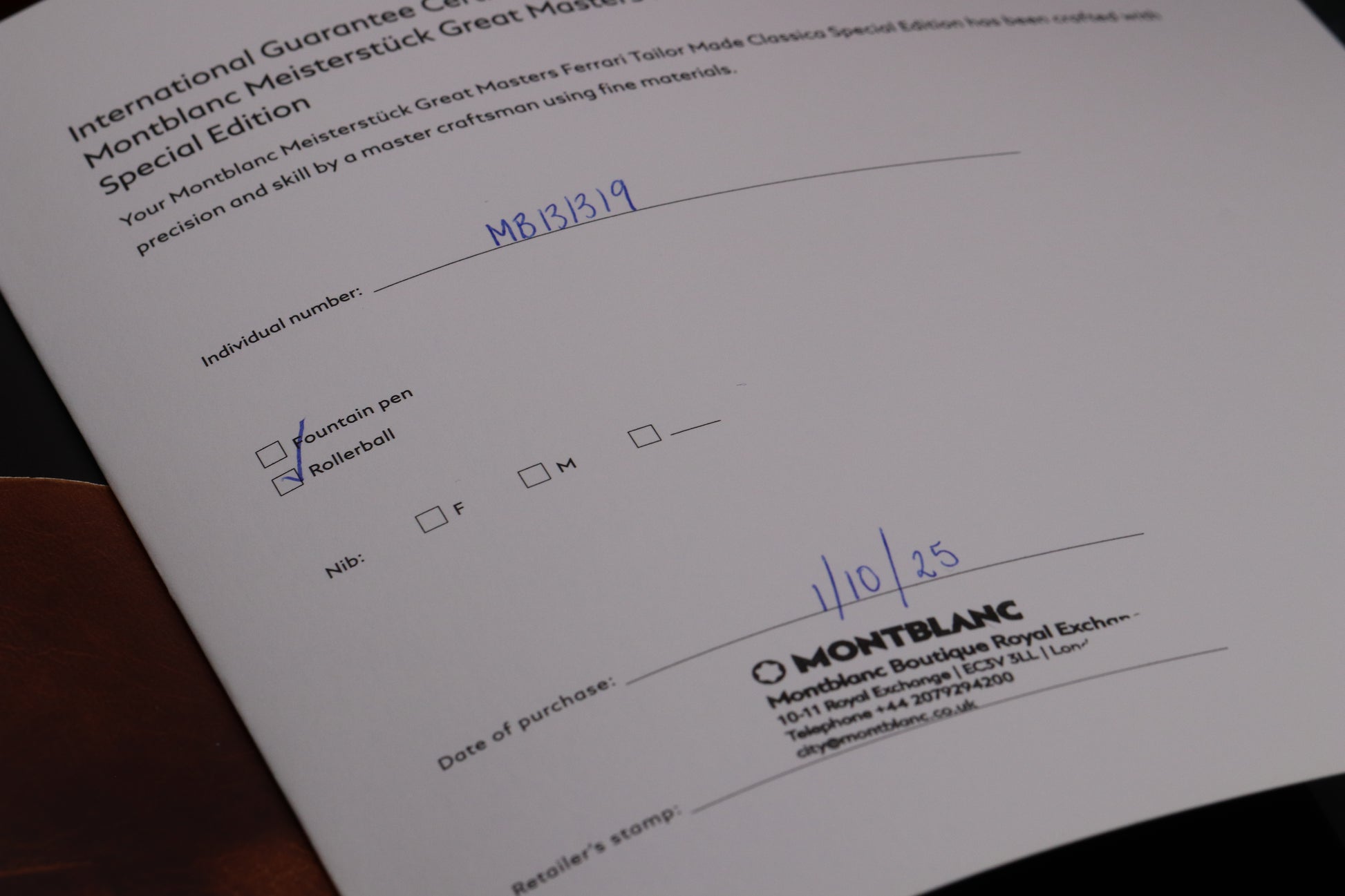 Thanks very much for looking at our listing for this delightful Montblanc Great Masters Ferrari Tailor Made Classica Rollerball Pen, which comes with its large Montblanc presentation box (including outer) and stamped booklet - confirming first purchase on 1st October 2025. The pen has barely been used and is presented in wonderful condition.