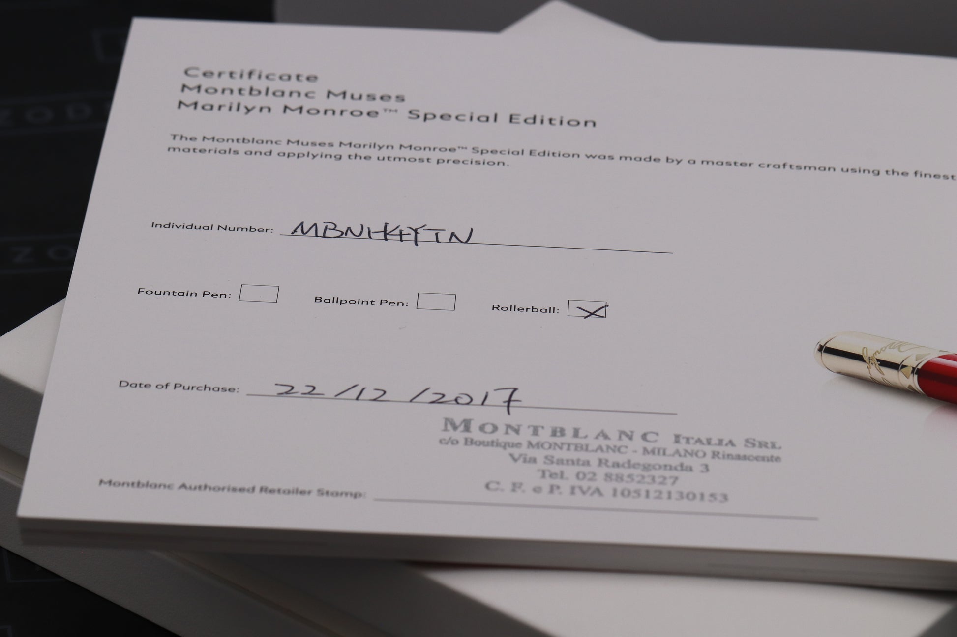 Thanks for looking at our listing for this Montblanc Muses Edition Marilyn Monroe Special Edition Red Rollerball Pen, which comes with its Montblanc presentation box (including outers) and stamped booklet - confirming first purchase on 22nd December 2017. The pen has barely been used and is presented in virtually as new condition.