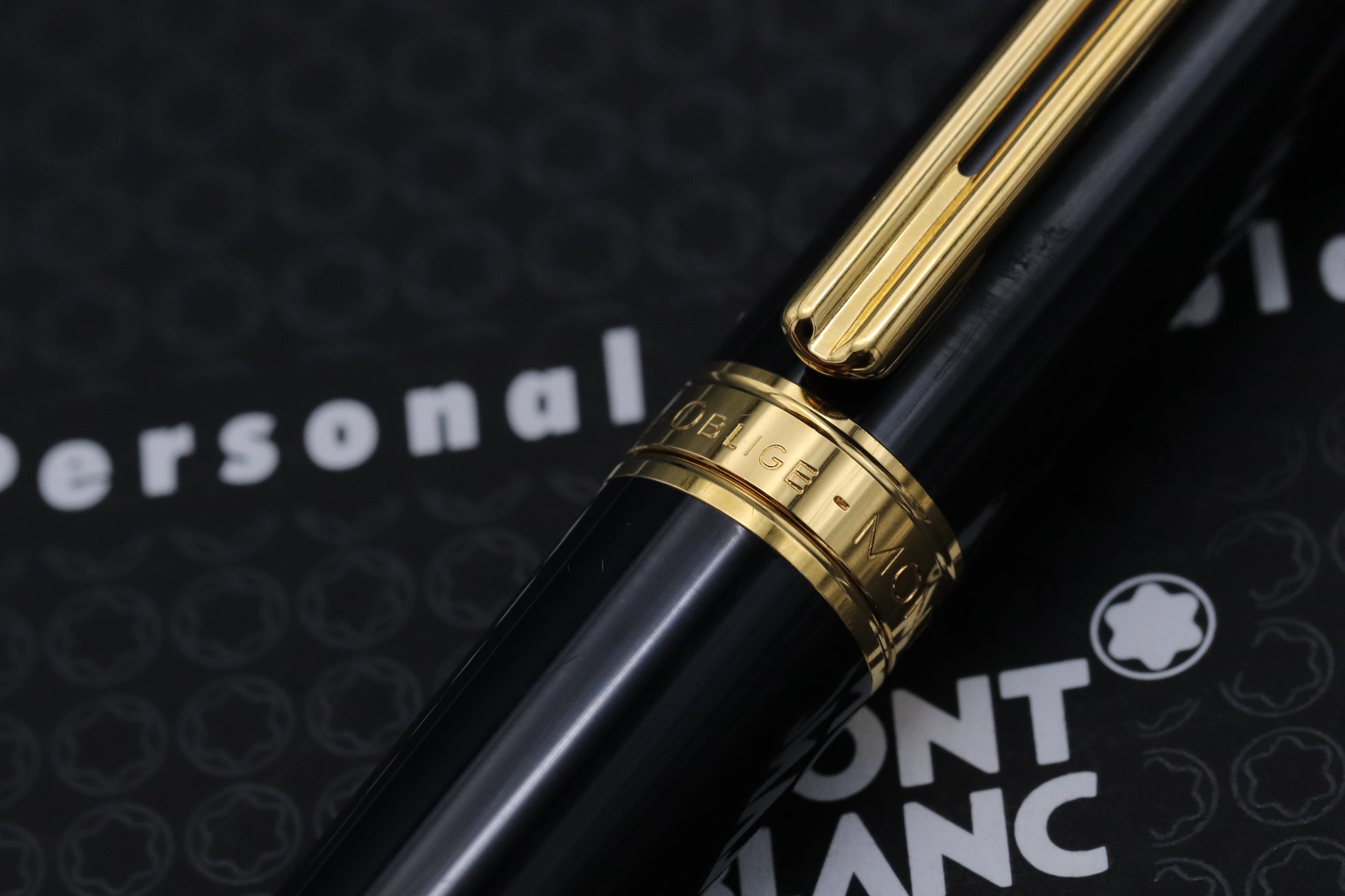 Thanks very much for looking at our listing for this Montblanc Noblesse Oblige Black Fountain Pen, which comes with its Montblanc presentation box and unstamped service guide. The pen has been regularly used, but is still presented in overall good condition - the M sticker, denoting a medium nib, remains on the barrel.
