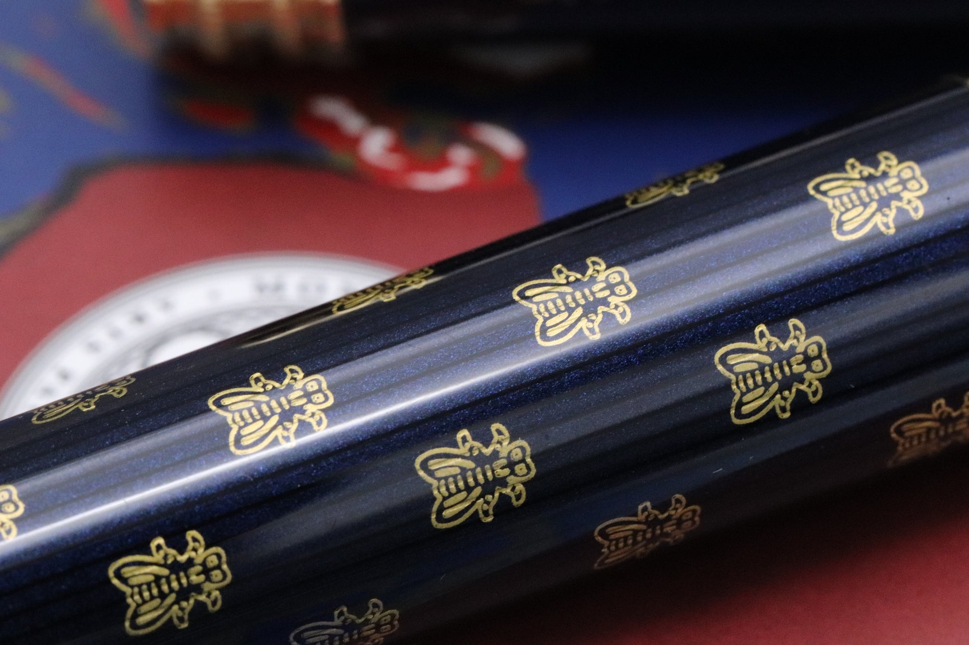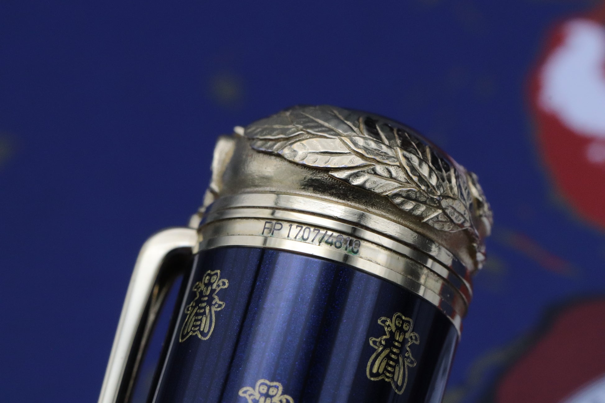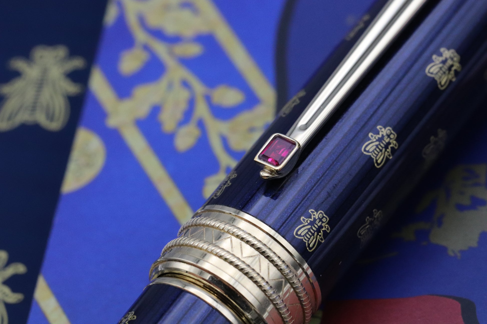 In 2021, Montblanc honoured the legendary political and military leader, Napoleon Bonaparte. The barrel and cap are finished with a navy blue lacquer, adorned with a bee design. The blue represents Napoleon’s uniform, with the bees diconnecting from Bourbons and linking to Merovingiens. The clip takes its inspiration from a blade, with the red stone paying homage to Josephine’s coronation ring.