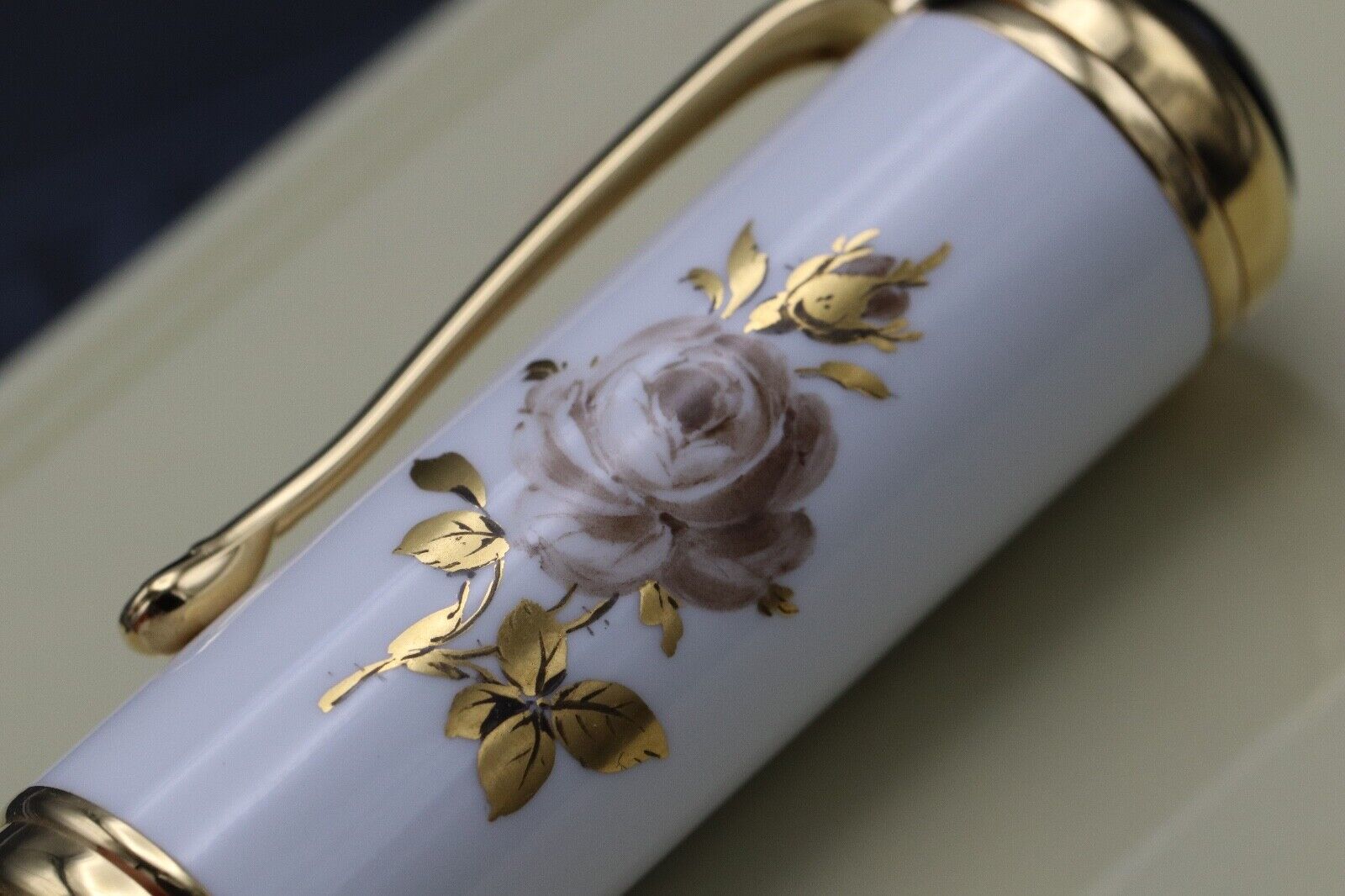 The gold-plated barrel and trim represents the luxury of court life. The cap is crafted from Meissen porcelain and decorated with a hand-painted, sepia-tones rose, finished in gold. This recalls the Marquise’s love of porcelain and also her favourite flower.