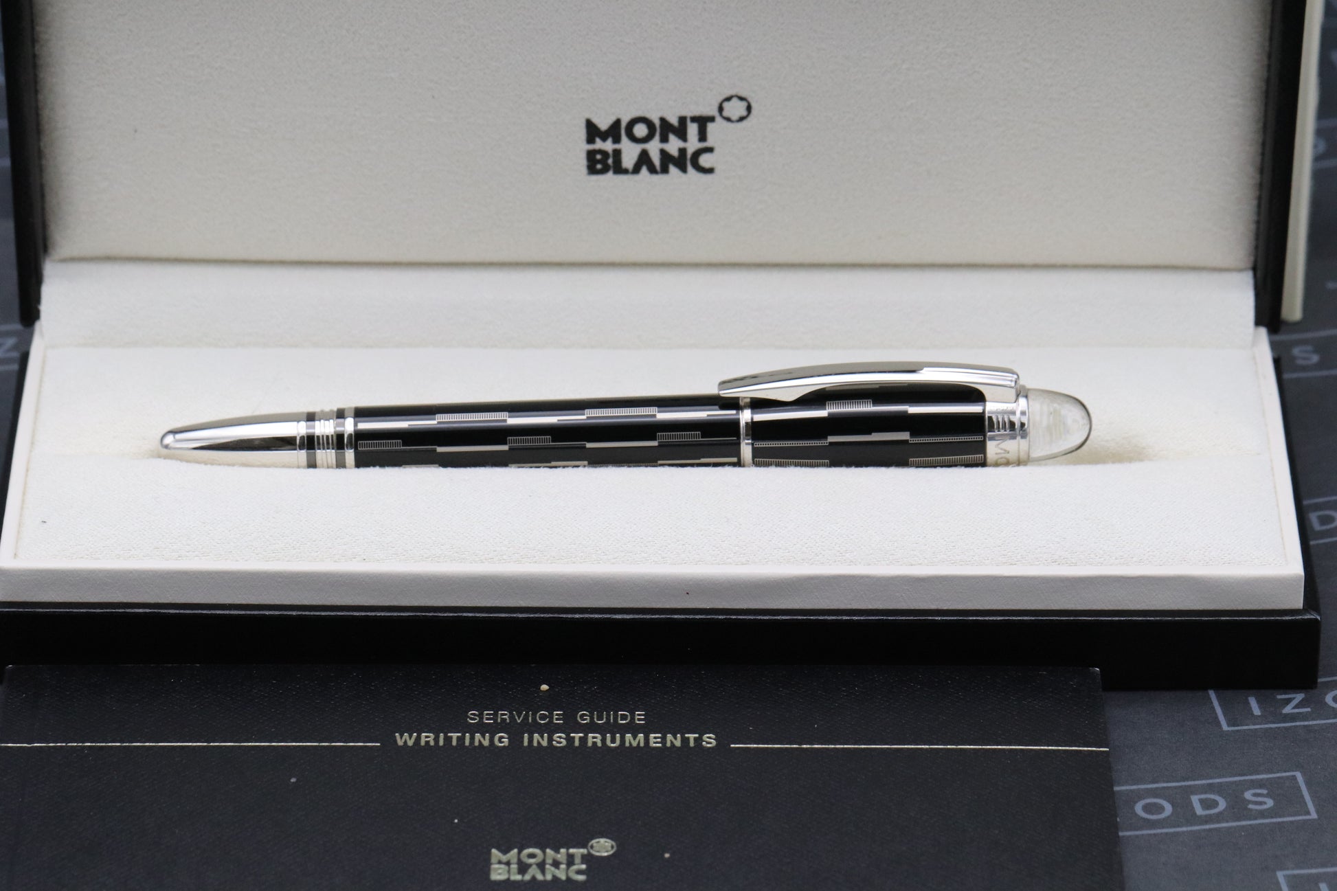 Thanks very much for looking at our listing for this Montblanc Starwalker Black Mystery Rollerball / Fineliner Pen, which comes with its Montblanc presentation box (including outer) and stamped service guide - confirming first purechase on 30th November 2013. The pen has been regularly, but carefully used, and is presented in very good condition.