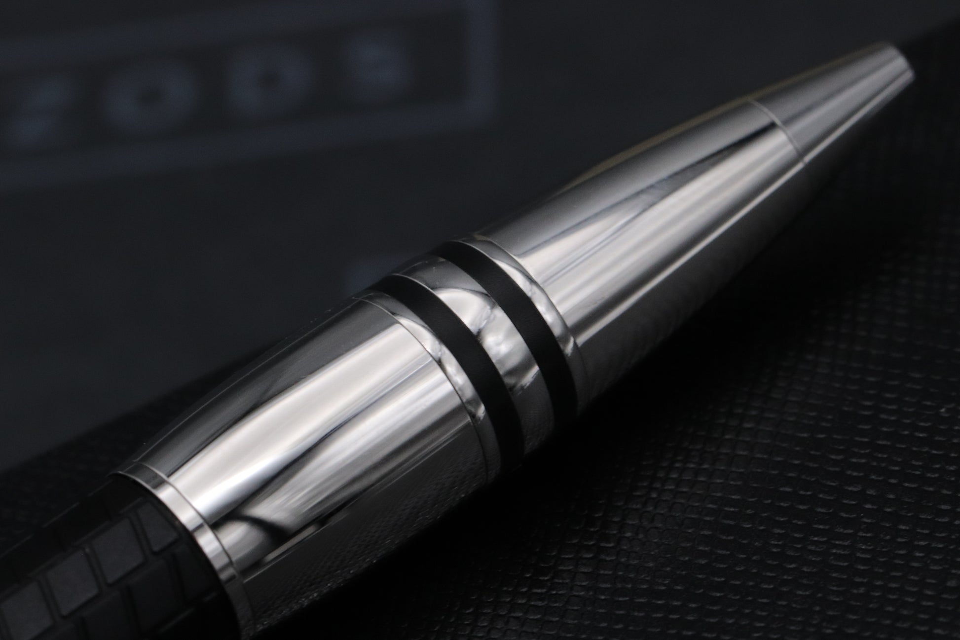 The barrel is crafted from black resin, which has a tyre tread pattern. The trim and section are platinum-coated.