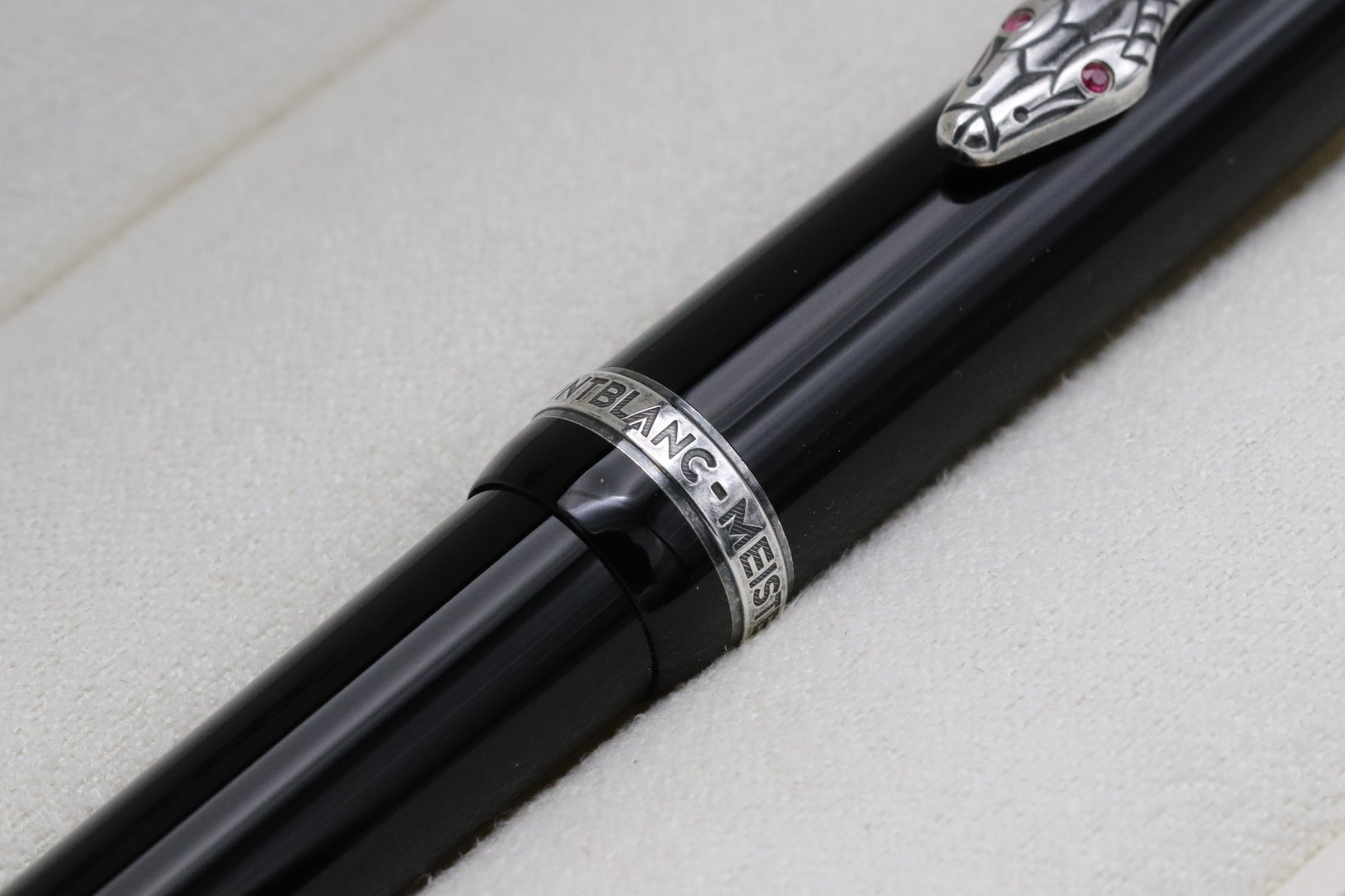 This is one of our favourite Writers Edition - the pencil is crafted from black resin, with the trim and serpent clip being sterling silver - the serpents eyes are set with two rubies.