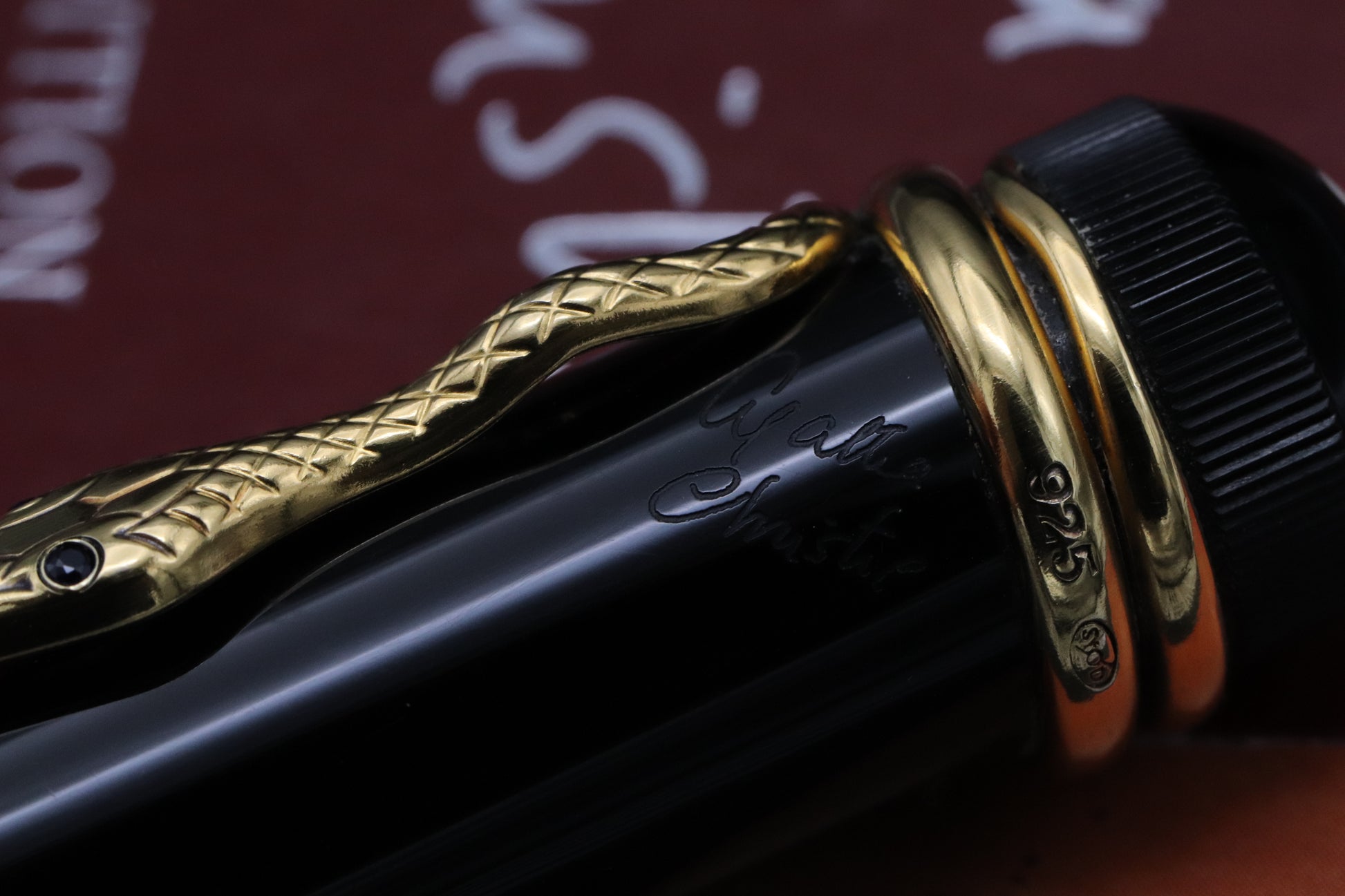 This is one of our favourite Writers Editions, with this pen being the rare vermeil version. The pen is crafted from black resin, with the trim and serpent clip being vermeil (gold-plating over sterling silver) - the serpents eyes are set with two sapphires.