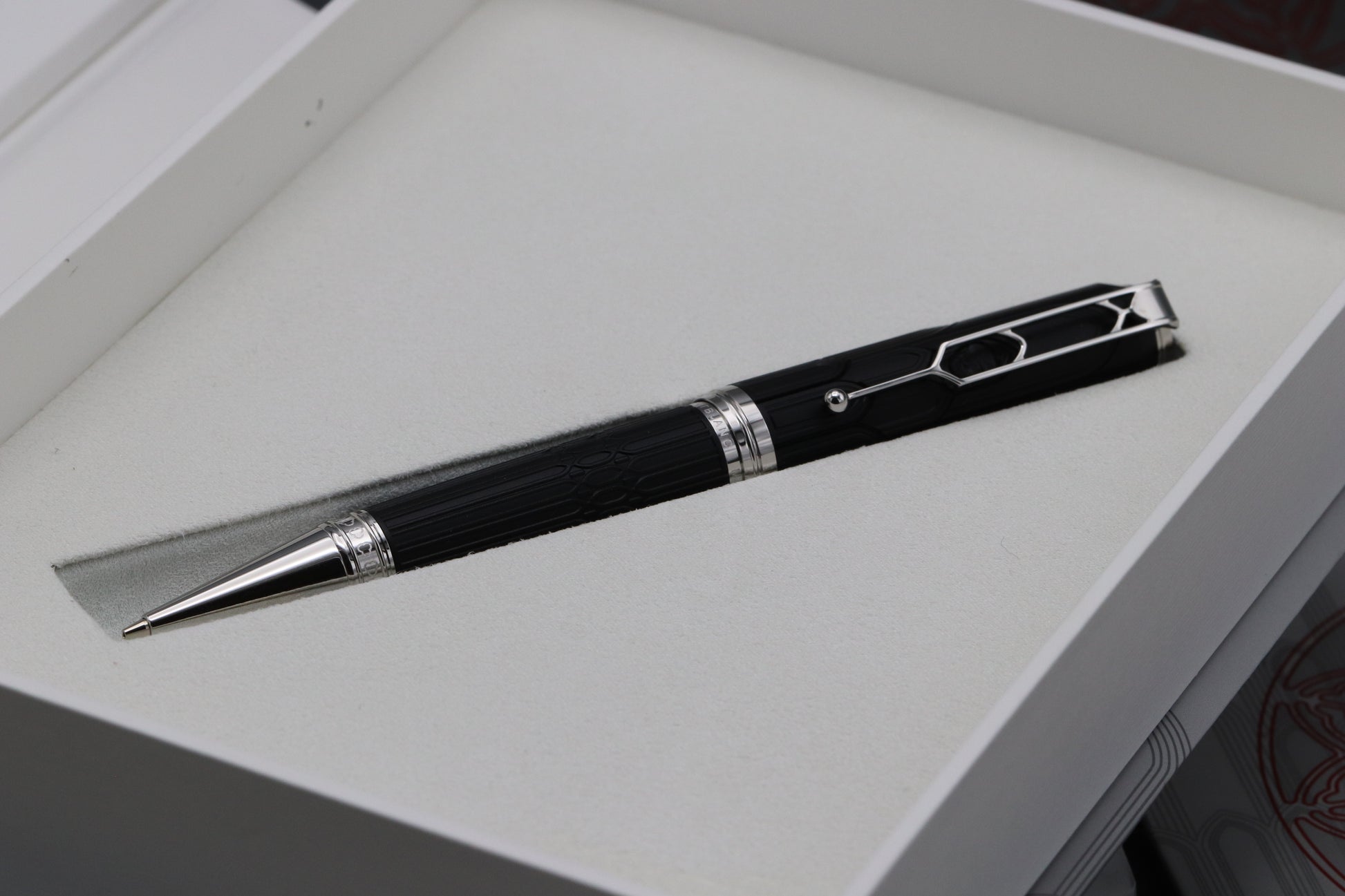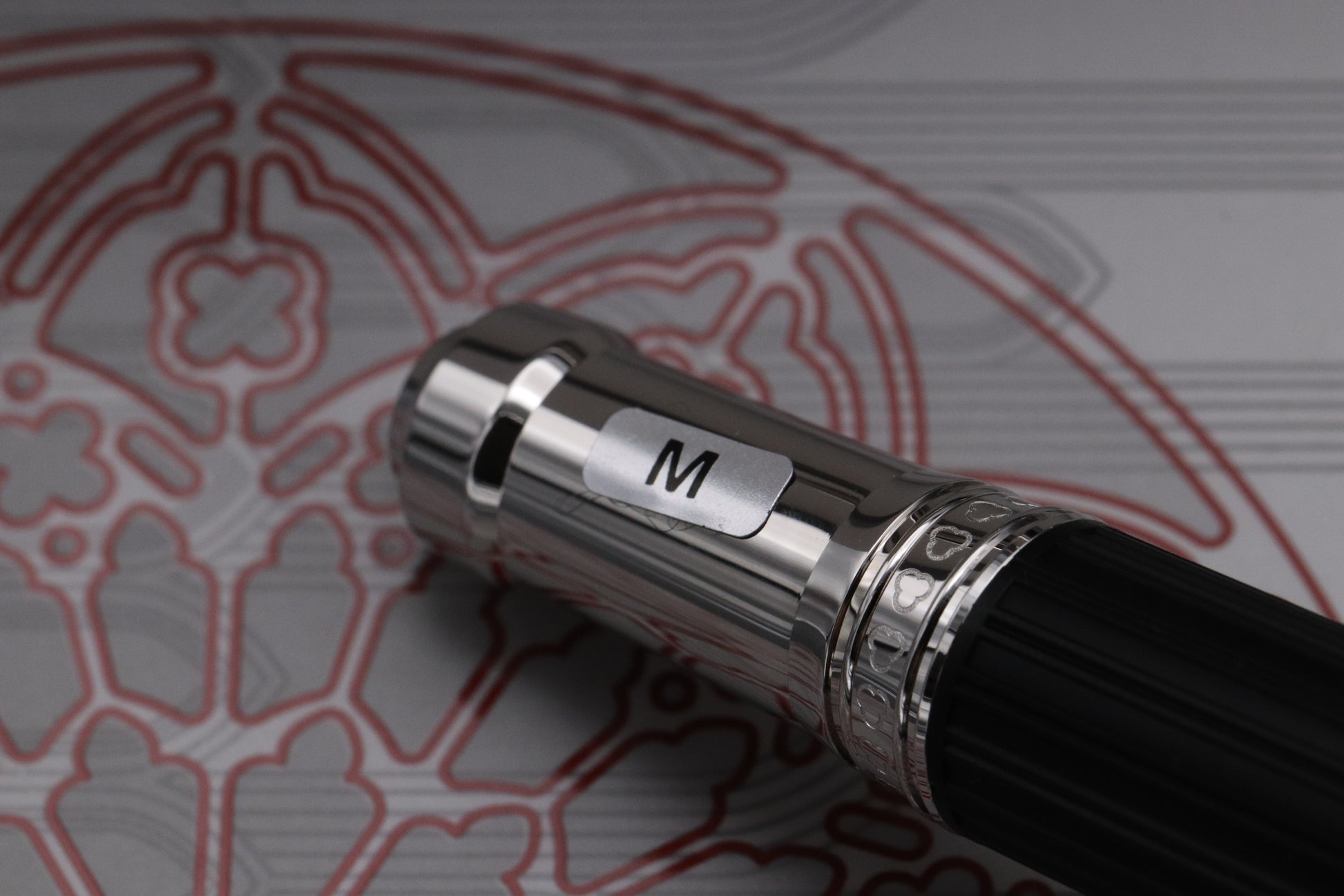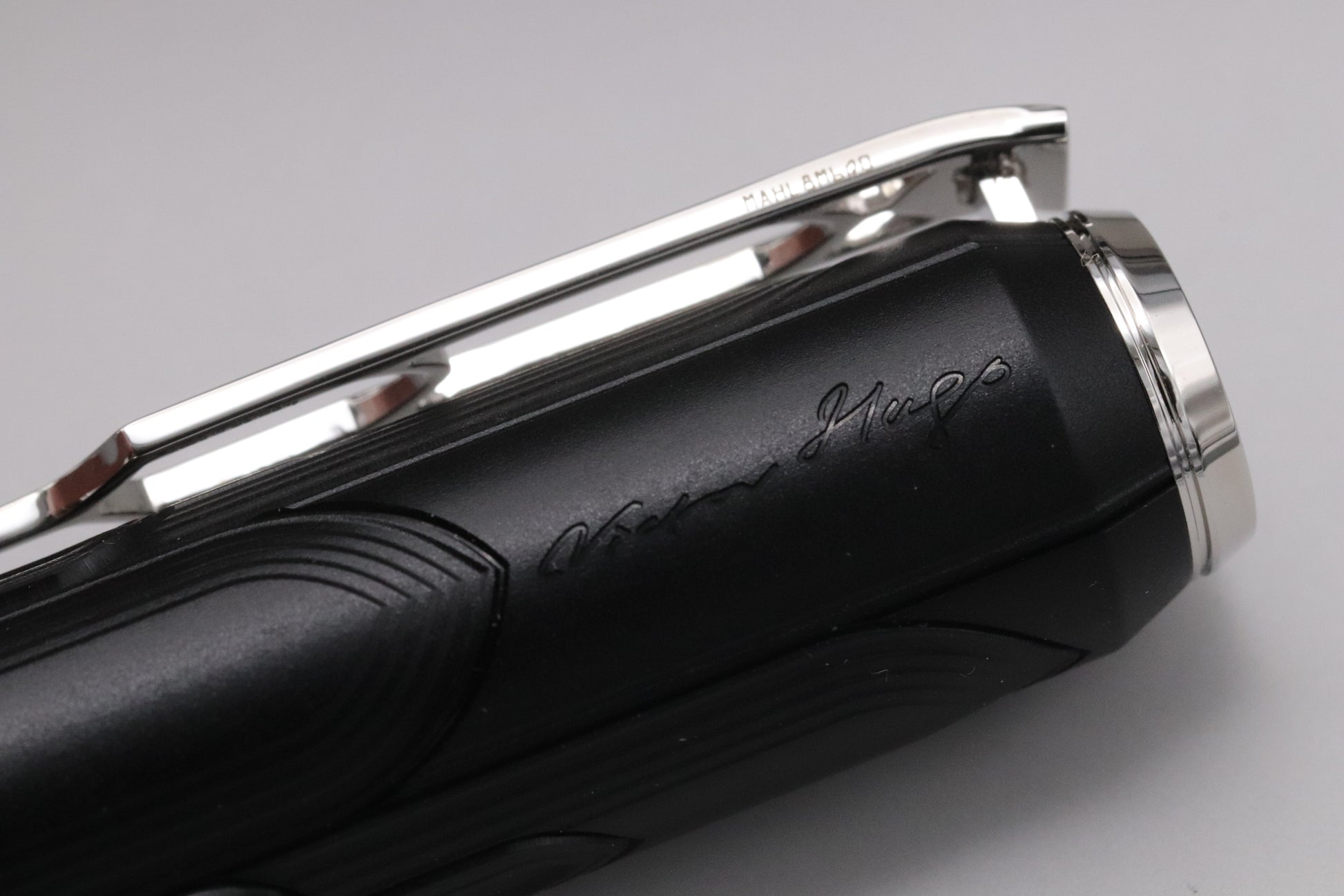 The design of the pen is inspired by Notre-Dame, with the cap being decorated with gothic arches and the end of the clip is shaped like the clapper in a bell – recalling Quasimodo and the bells of Notre-Dame. Victor Hugo’s signature is engraved on the cap.