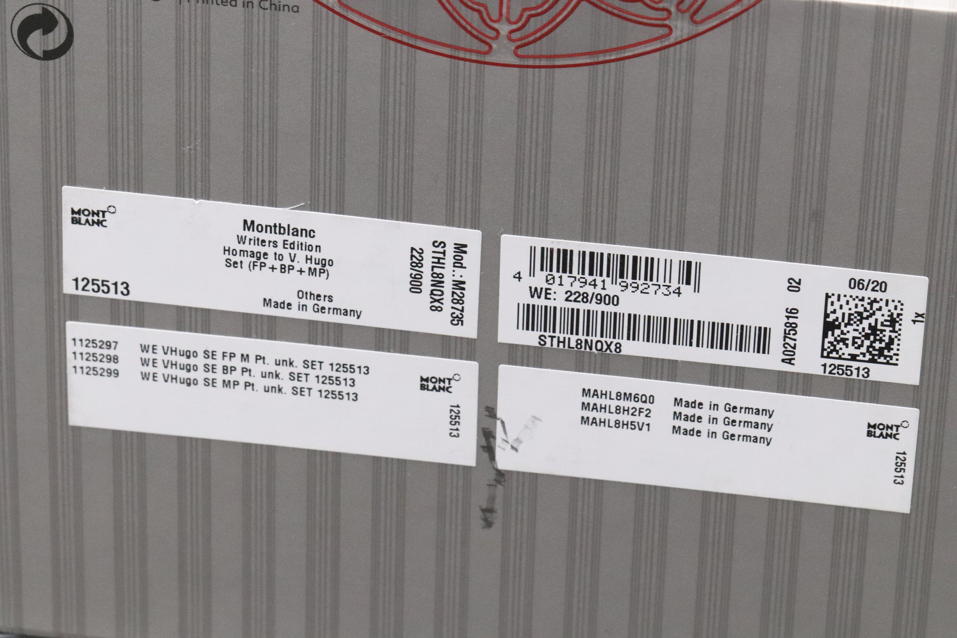 Thanks very much for looking at our listing for this wonderful Montblanc Victor Hugo Writers Edition Fountain Pen, Ballpoint Pen and Mechanical Pencil Set which comes with its Montblanc presentation boxes (including outer - a few small marks to this) and unstamped information booklets . All three writing instruments and are unused and are presented in essentially as new condition - the M sticker, denoting a medium nib, remains on the cone. Only 900 sets were produced and this is number 228.