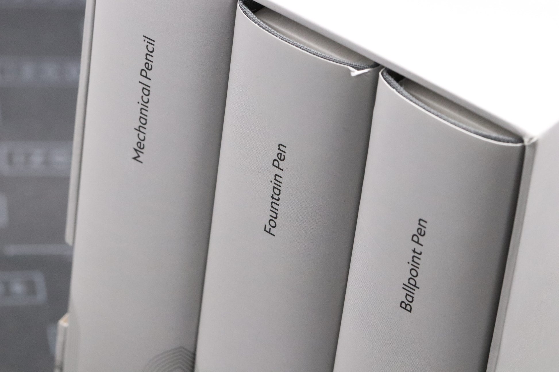 The fountain pen is fitted with an 18k medium nib and it's a piston filler, so your choice here is bottled ink. The ballpoint will come with a new refill and the pencil has 0.7mm leads.