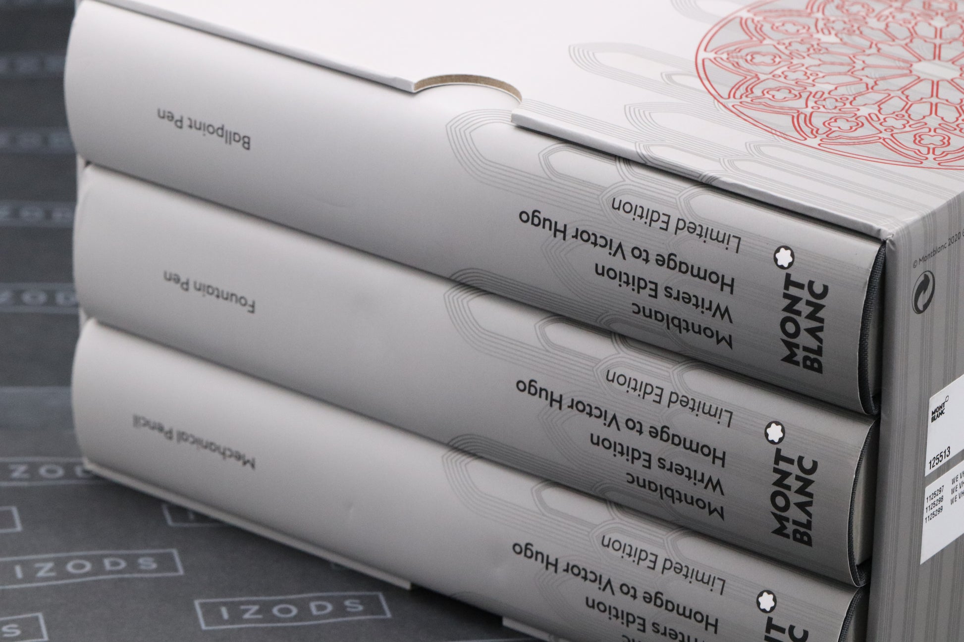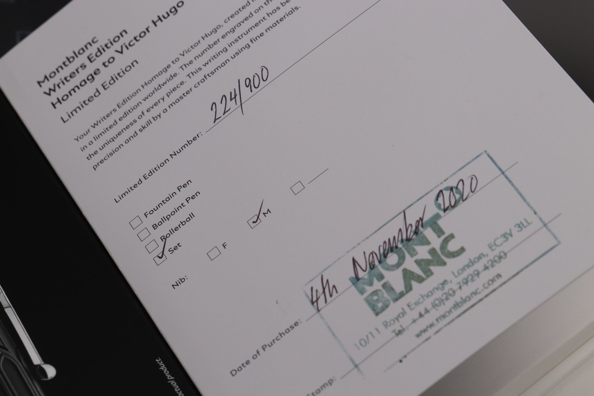 Thanks very much for looking at our listing for this wonderful Montblanc Victor Hugo Writers Edition Fountain Pen, Ballpoint Pen and Mechanical Pencil Set which comes with its Montblanc presentation boxes (including outer) and stamped information booklets - confirming first purchase on 4th November 2020 . All three writing instruments have barely been used and are presented in essentially as new condition - the M sticker, denoting a medium nib, remains on the cone. Only 900 sets were produced and this is number 224.