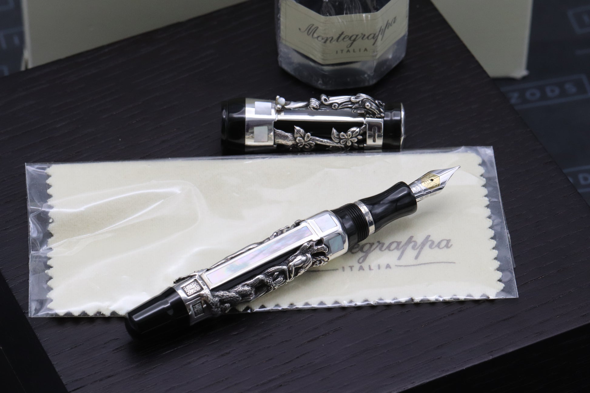 Thanks very much for looking at our listing for this wonderful Montegrappa Aphrodite Sterling Silver Fountain Pen, which comes with a large wooden Montegrappa presentation box (originally for a different model), polishing cloth and bottle of ink. The pen has just returned from Montegrappa in Italy, where it was fully serviced - they also polished all elements of the pen and as such it's presented in fantastic condition. Only 1912 were produced and this is number 1042.