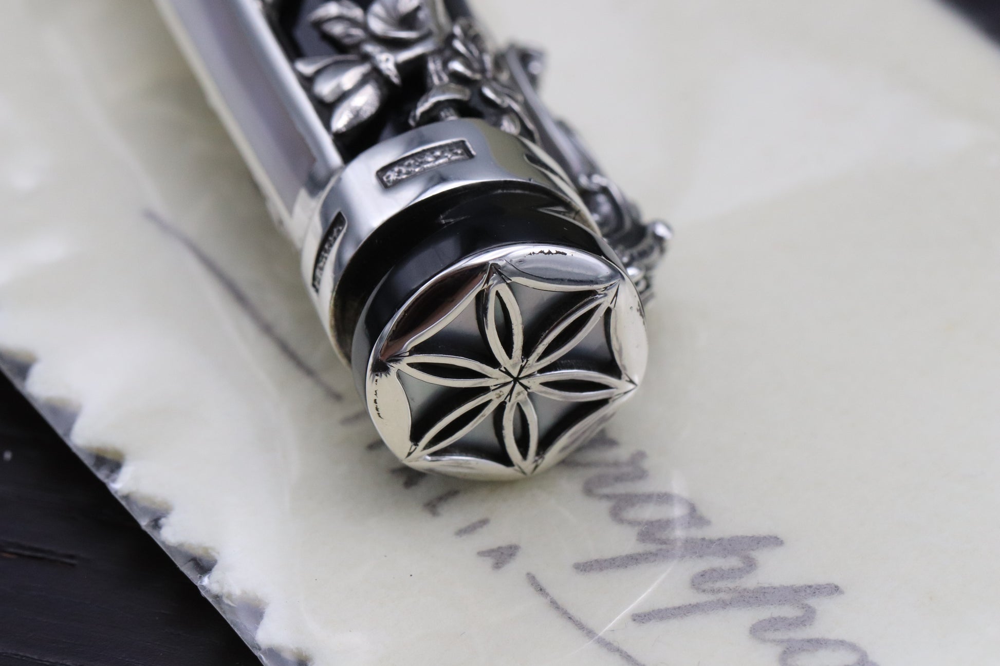 Released in 1997, the Aphrodite is a deeply impressive and substantial writing instrument...the pen is crafted from ebonite and the sterling silver overlay was created using lost-wax castings. Featuring Aphrodite and Adonis, the pen honours the notion of love in Greek mythology. Mother-of-pearl inlays shimmer beautifully against the sterling silver.