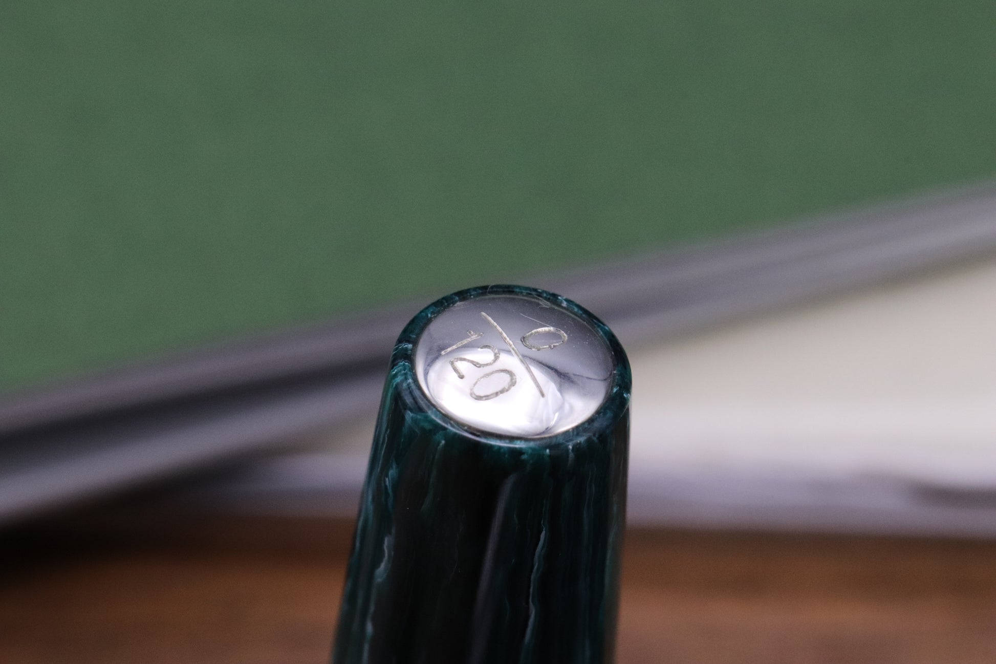 The barrel and cap are crafted from glorious multi-toned green, white and black resin, with the trim and bands being sterling silver.