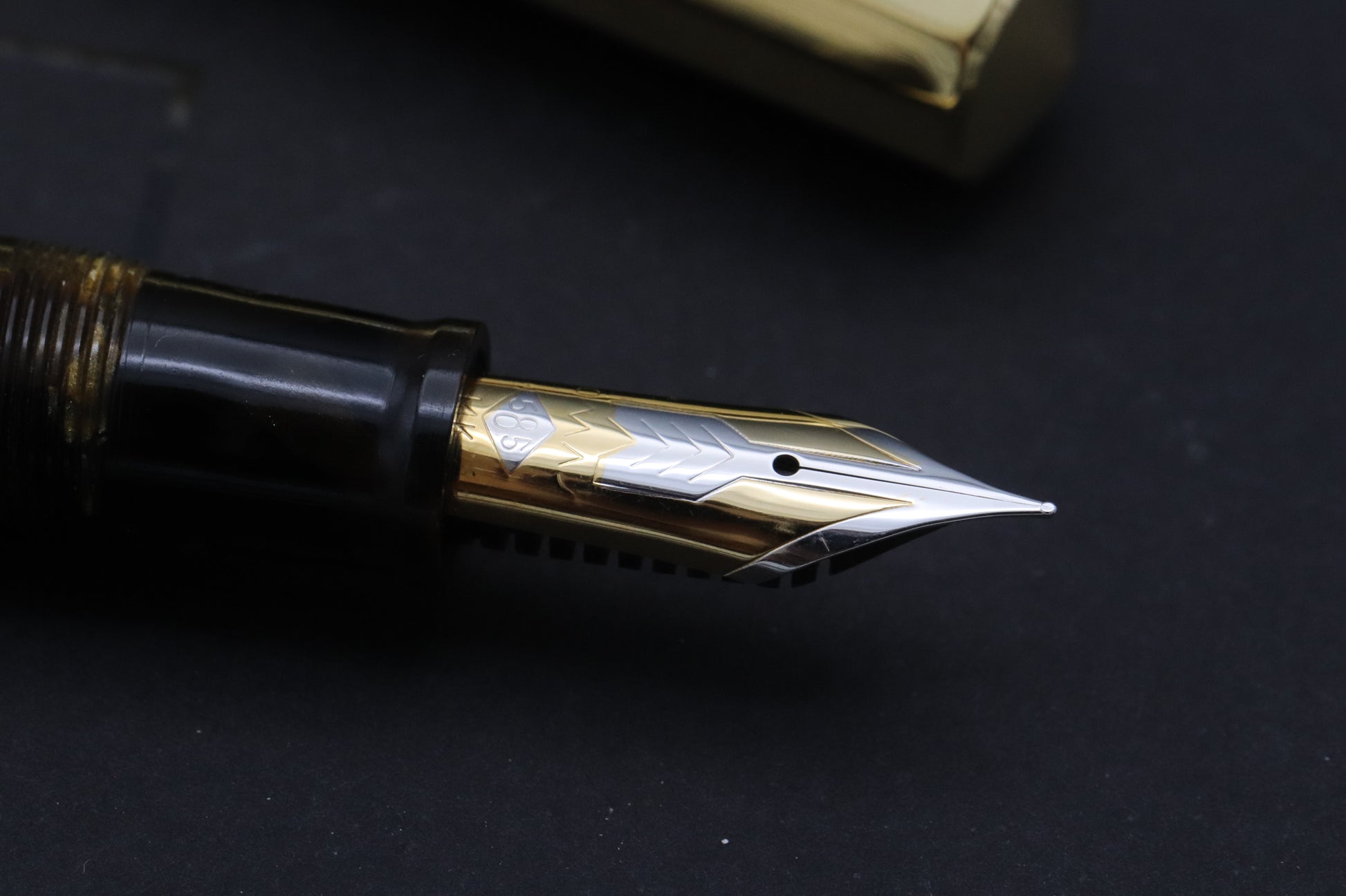 The barrel, section and cone are crafted from iconic 'Autunno' celluloid, which features myriad of black and golden tones. The cap is sterling silver, which is then gold-plated. The Vermeil cap works brilliantly with the tones of the celluloid.