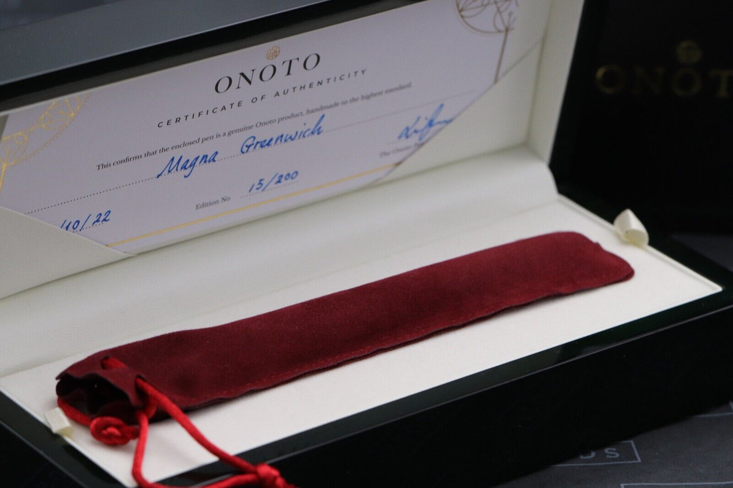 Thanks for looking at our listing for this Onoto Magna Greenwich Limited Edition Fountain Pen, which comes with its Onoto presentation box, information leaflets and certificate - confirming first purchase on 14th October 2022. The pen has been lightly used and is presented in overall fantastic condition.