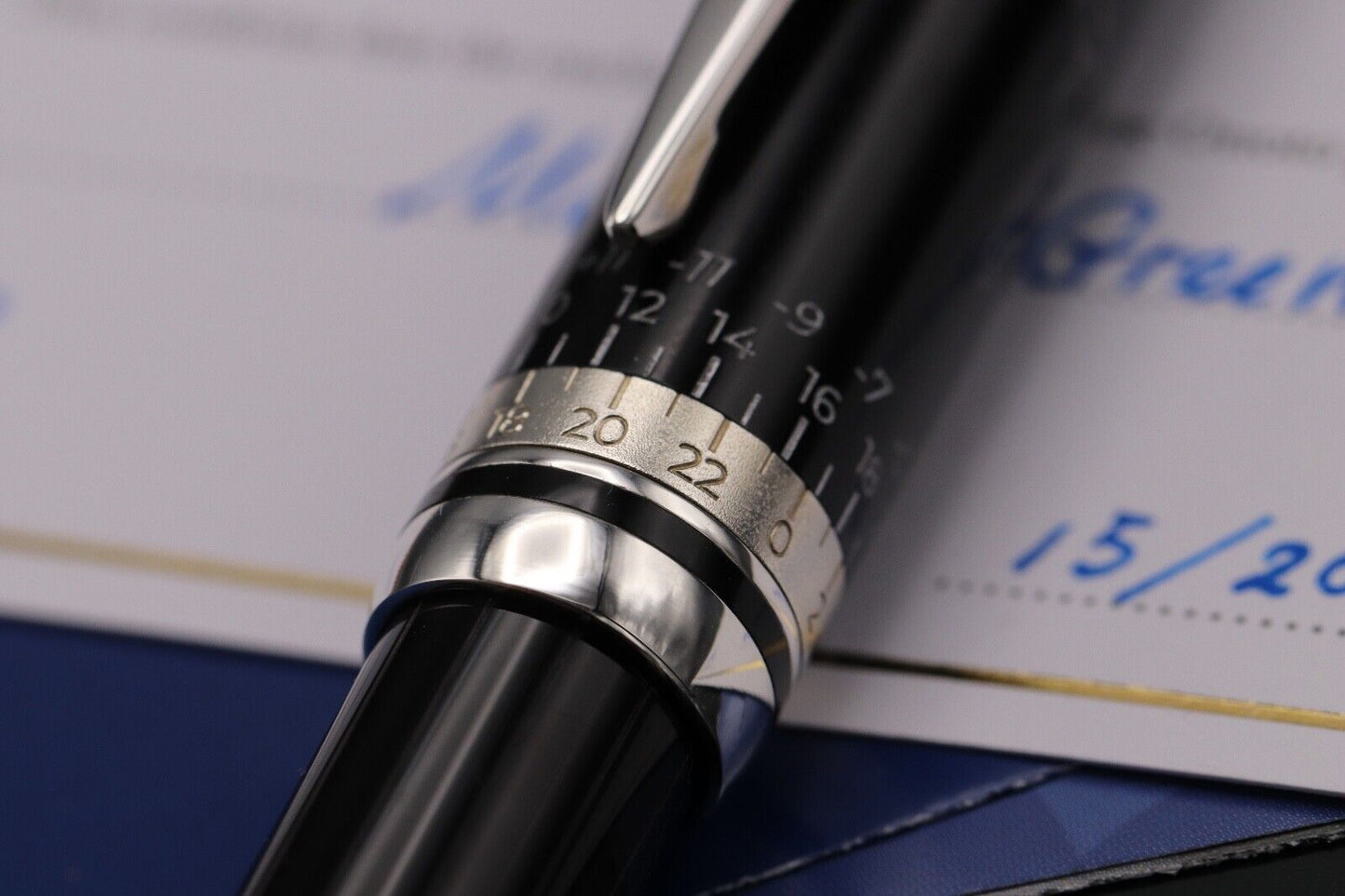 A pen that pays tribute to Greenwich Mean Time, with a world map engraved on the black resin cap. The cap also features a rotating gauge, which allows you to calculate local time in relation to GMT. The 12 engraved lines on the barrel represent the 12 time zones. The trim is sterling silver.