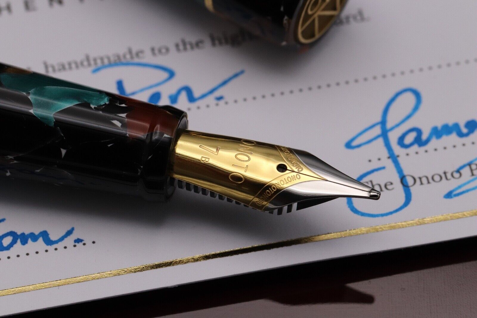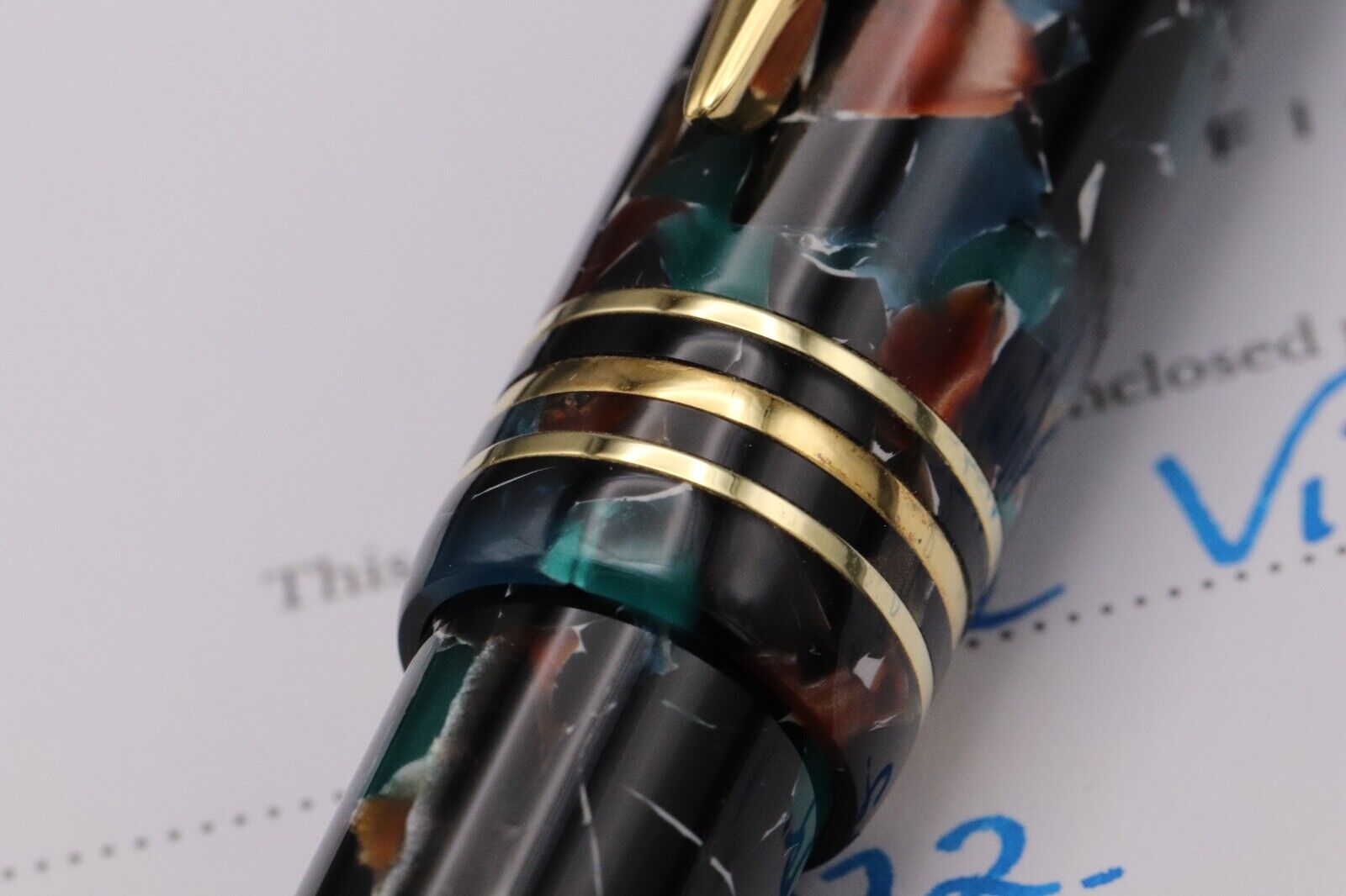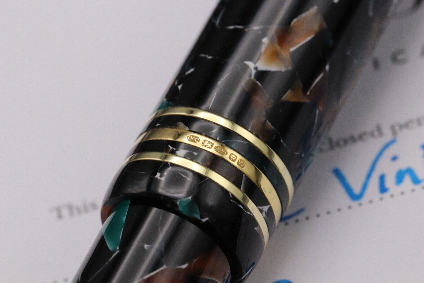 This is an extremely rare offering from Onoto and we absolutely love it. In November 2022, they produced only 3 pens from a vintage resin, which features myriad of tones and shapes. The trim is gold-plating over sterling silver. The barrel is fitted with the additional brass weight.