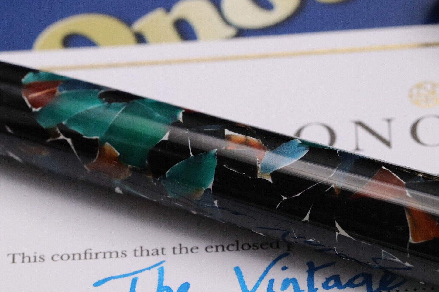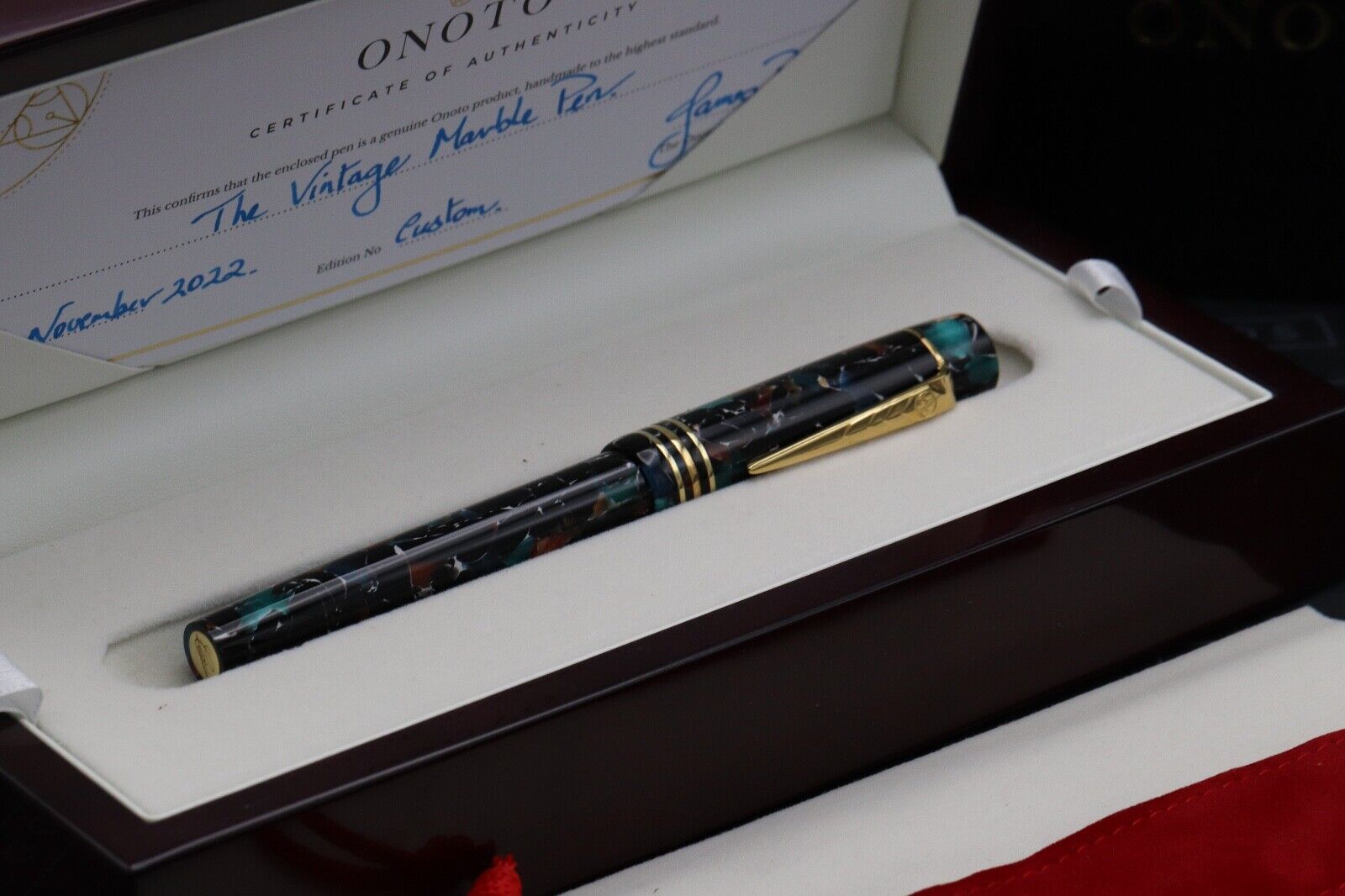 Thanks for looking at our listing for this Onoto Magna The Vintage Marble Limited Edition Fountain Pen, which comes with its large lacquered wooden presentation box (including outer), information leaflets and certificate – confirming first purchase in November 2022. Only 3 unnumbered pens were produced.. The pen has barely been used and is presented in wonderful condition.